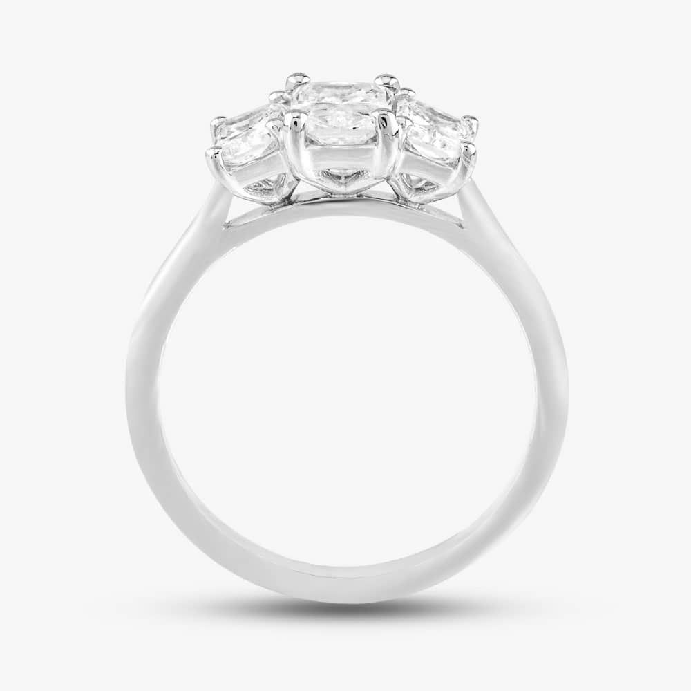 Crafted with a touch of simplicity, this three-stone ring exudes timeless elegance. The delicate platinum is adorned with an SI1 clarity, 0.71ct radiant-cut white centre diamond with a graded colour of E, accentuated with a single radiant-cut white diamond set on each side, enhancing the centre stone, with a total shoulder carat weight of 0.76ct. Each stone is set in a classic four-claw setting, and promises to sparkle with every movement, making this ring a timeless symbol of subtle luxury.