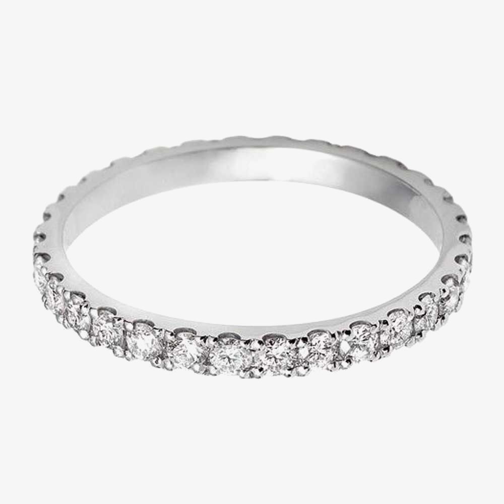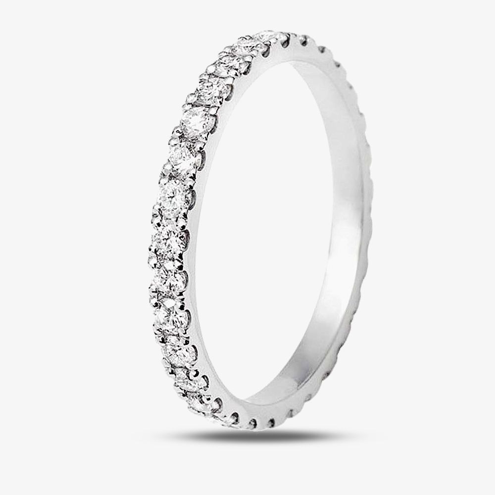 As the top of the line metal for wedding bands, platinum is at the forefront of beauty and quality, this elegant 2mm diamond set eternity ring is no exception. The bright and durable metal accentuates dazzling diamonds that give a radiant shine you will love to flaunt. Featuring brilliant cut diamonds with a total weight of 0.49ct-0.66ct, colour H and clarity SI.