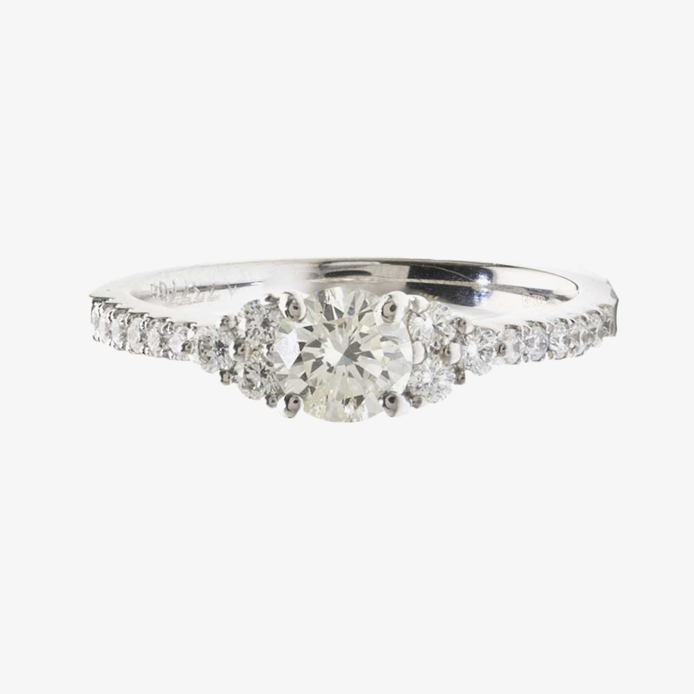 This seven stone cluster has been arranged into a marquise-shaped setting, with a large brilliant cut centre stone and a triangular cluster of smaller diamonds to either flank, before the ring is finished with pavé set shoulders.