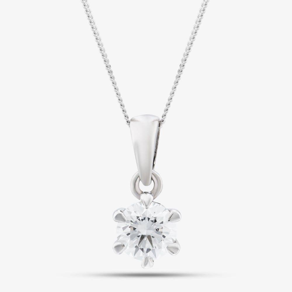 A platinum silver pendant necklace featuring a brilliant-cut diamond in a classic six claw setting, weighing 0.40ct. Suspended on a timeless belcher chain, the diamond is certified with a colour grade of D and a clarity grade of SI1, ensuring exceptional brilliance and quality.
