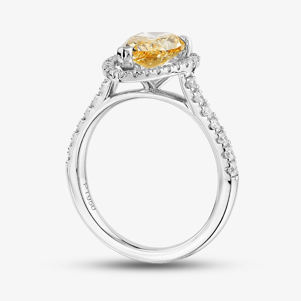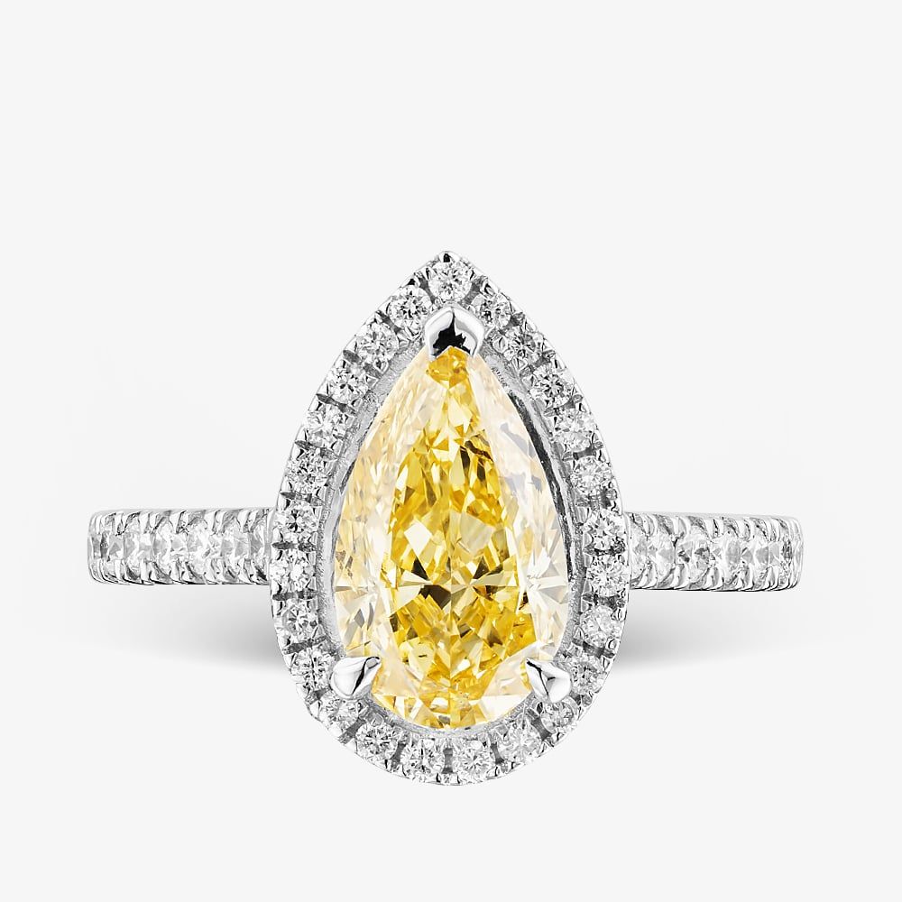 Radiate brilliance with this Fancy Vivid Yellow Pear Cut Lab-Grown Diamond Cluster Ring. The vibrant 2.00ct yellow pear cut diamond is surrounded by a halo and shoulder-set of brilliant-cut white lab-grown diamonds totally 0.63ct, creating a dazzling contrast and exceptional sparkle. Expertly crafted in platinum, each ethically sourced, certified diamond reflects timeless elegance and sophisticated luxury, making this ring a perfect statement piece for special occasions or a cherished addition to any collection.