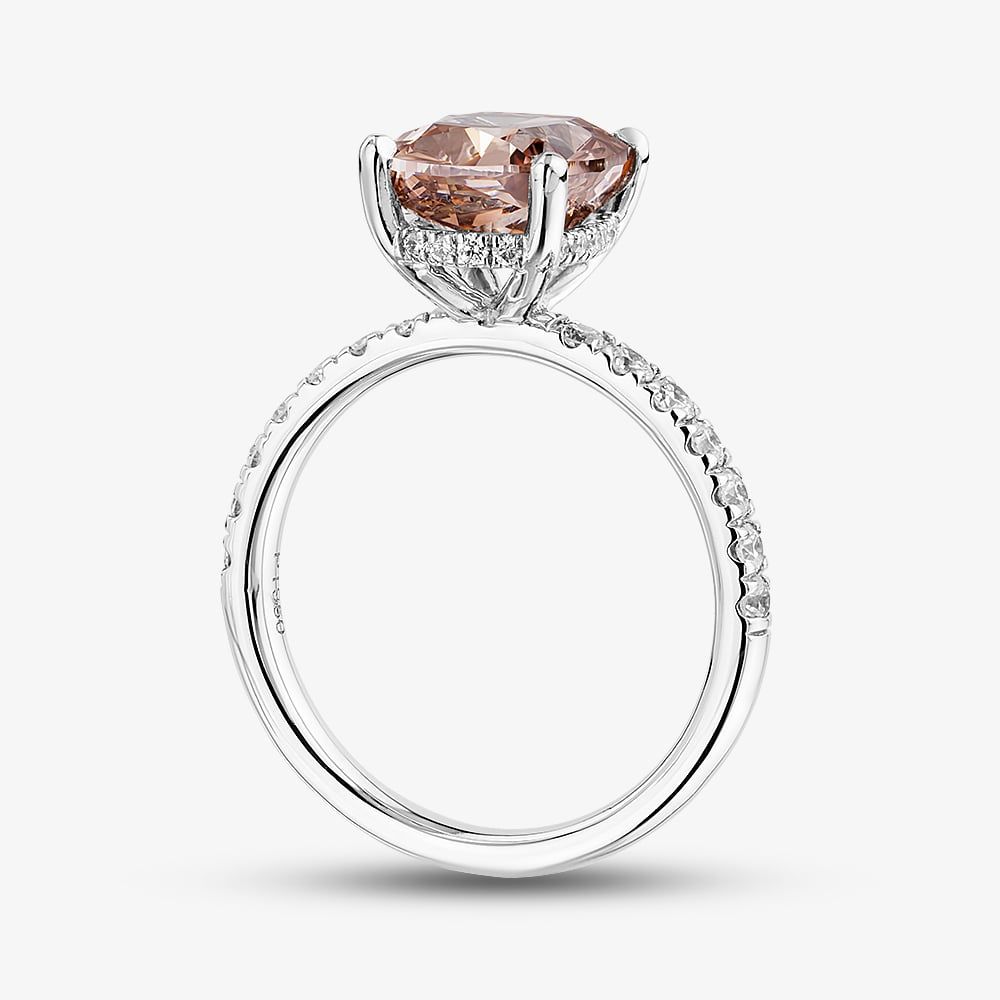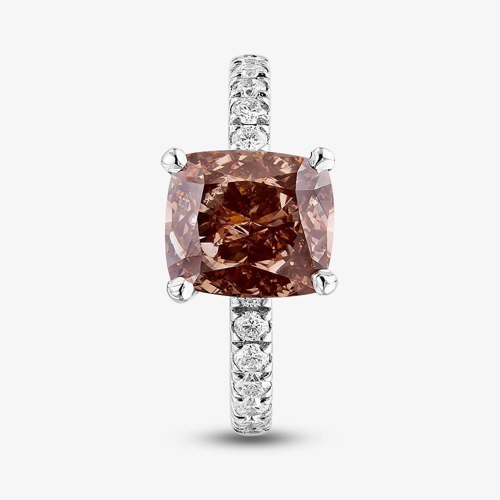 Exude elegance with this Fancy Vivid Brown-Pink Cushion Cut Lab-Grown Diamond Ring, a masterpiece of colour and craftsmanship. The radiant 3.00ct pinkish brown centre diamond is compliment by a band shoulder-set with brilliant-cut white lab-grown diamonds totalling 0.45ct, adding a subtle yet striking sparkle from every angle. Crafted in platinum, this ethically sourced, certified ring combines timeless sophistication with modern luxury. Perfect for marking a momentous occasion or adding a touch of refinement to your collection, it is a statement of unparalleled beauty and enduring style.
