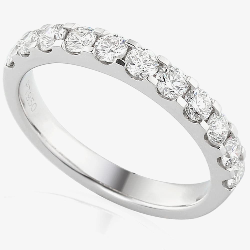 This pretty eternity ring features thirteen identical diamonds, set into a scalloped channel and held in place with shared claws, enabling this ring to be paired with a textured shoulder-set solitaire or cluster to produce a bridal set.