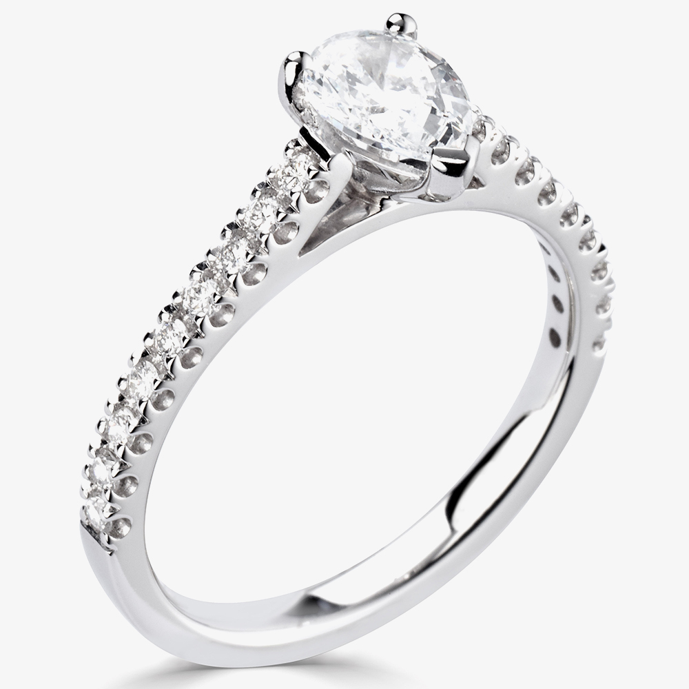 A 0.30 carat plus certificated pear-cut, 6mm x 4mm centre diamond, hand set in a platinum claw mount with 0.24ct diamond set shoulders.