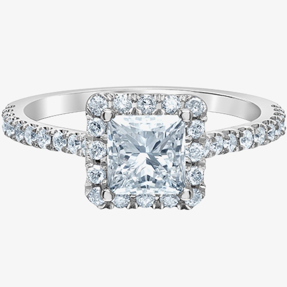 This modern certificated shoulder set halo ring has been crafted in platinum and features a sparkling princess cut Lab Grown Diamond centre with a secure four claw setting, finished with round pave Lab Grown Diamond shoulder design. This diamond ring catches the light beautifully and would make the perfect engagement ring.