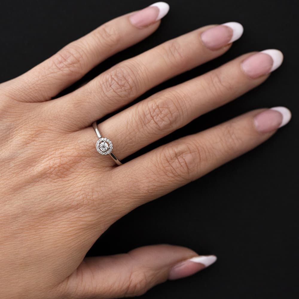 A gorgeous offering as an engagement ring, set to be an eye-catching addition to any bridal set. This ring features a certificated brilliant cut centre diamond hand set in a platinum four-claw setting and framed with a floating diamond halo. The certified centre stone of this ring is 0.15ct, with the overall diamond weight totalling 0.23ct with the surrounding stones included.