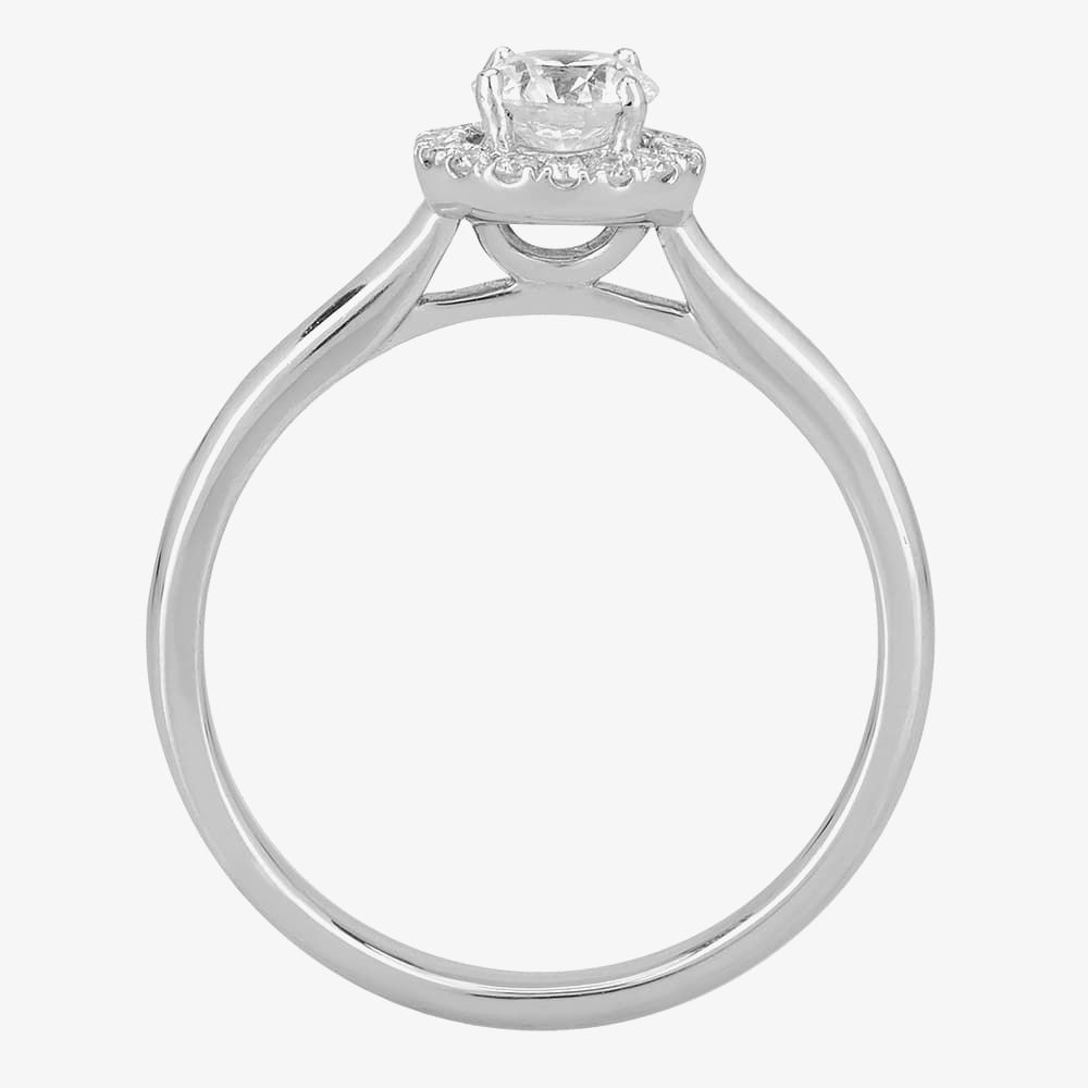 A gorgeous offering as an engagement ring set to be an eye-catching addition to any bridal set. This ring features a certificated round brilliant cut centre diamond hand set in a platinum four-claw setting and framed with a floating diamond halo. The certified centre stone of this ring is 0.33ct in weight, with the overall diamond weight totalling 0.49ct with the surrounding stones included.