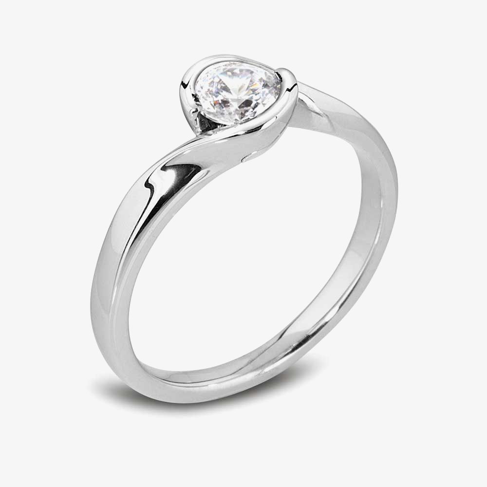 This unusual twist ring would be a perfect part of your bridal set. The gorgeous silvery hue of the demi-flush bezel and shank provides a startling contrast next to the distinctive round brilliant diamond it secures, whilst the heavy twisted profile allows for a more unusual wedding band.