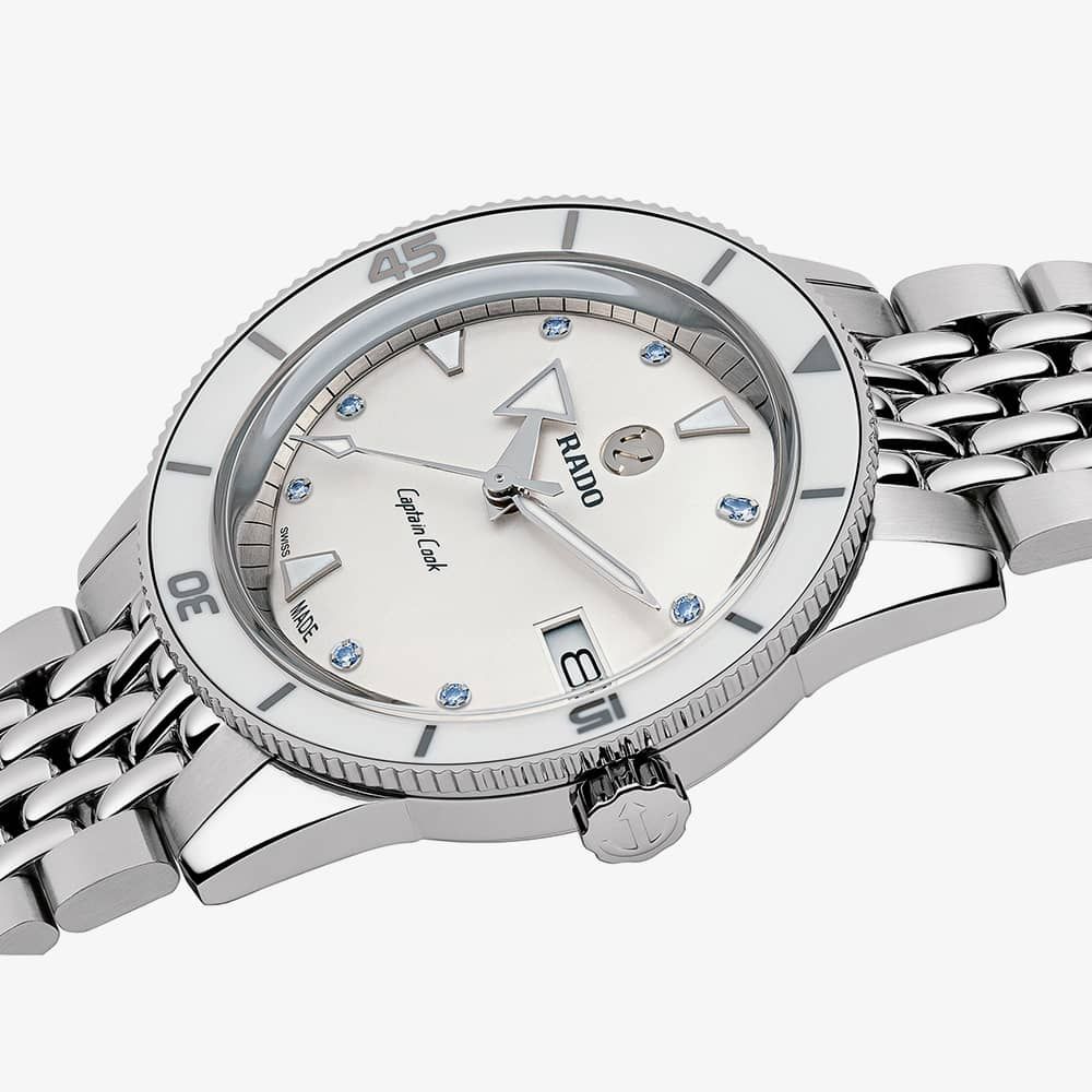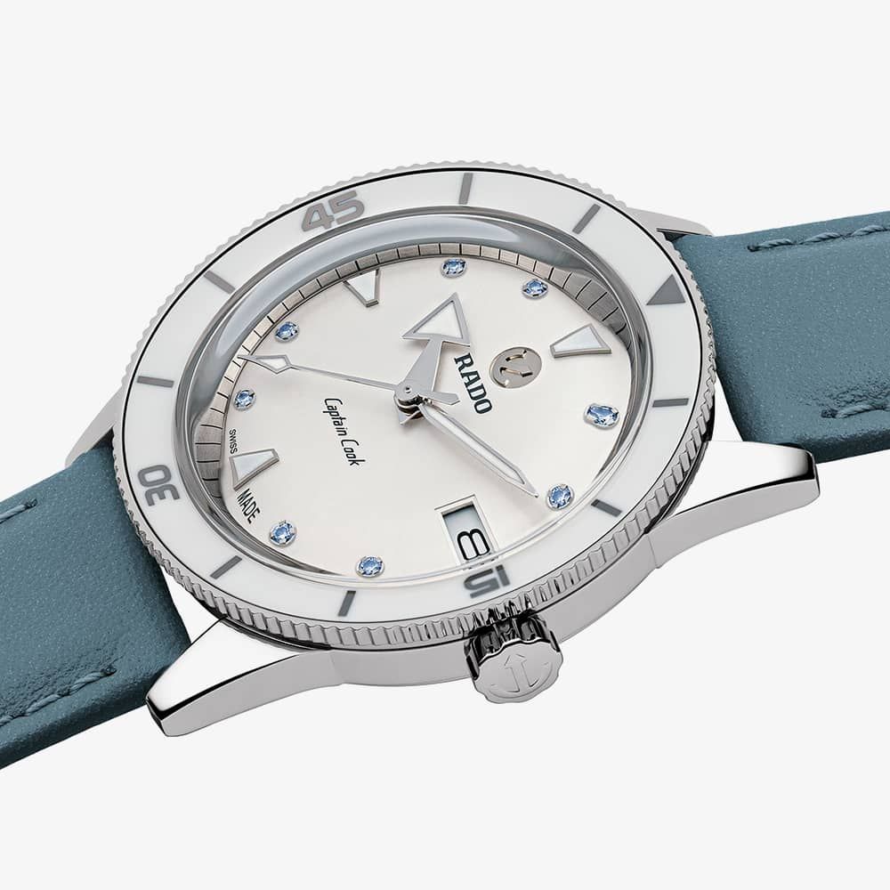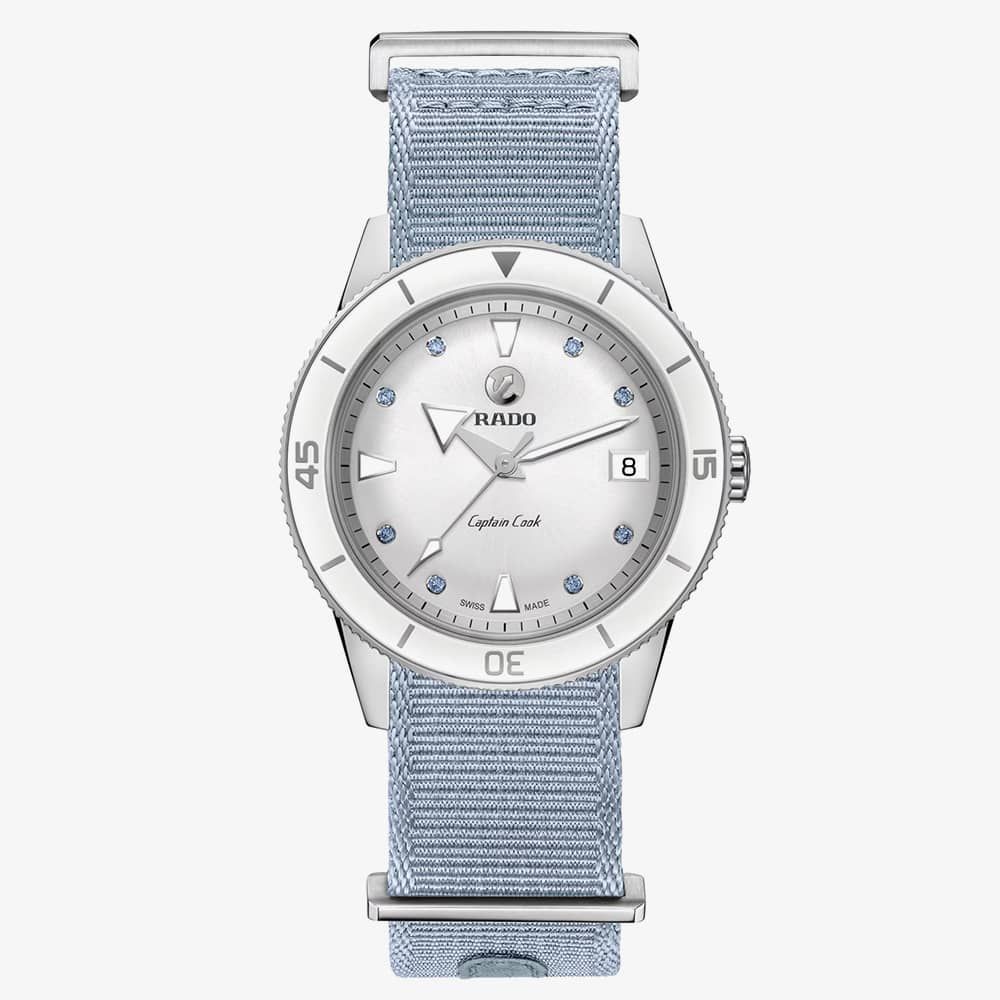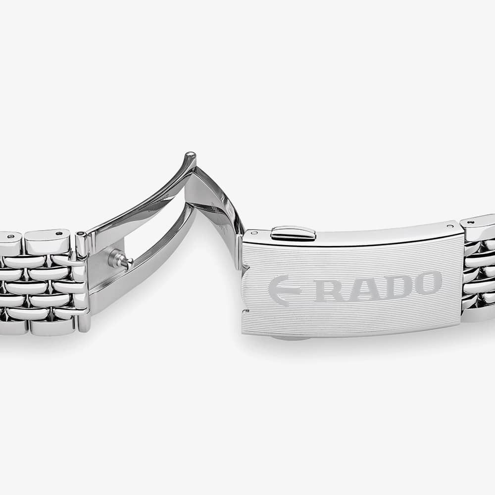This watch is a modern take on the iconic Rado timepiece. Adorned with eight ice-blue sapphires as hour markers on a pristine white dial, it is framed by a bezel featuring a white high-tech ceramic inlay. This versatile timepiece comes with three straps: a rice grain stainless steel bracelet, a light blue Nato strap, and a blue leather strap with blue stitching. Changing between them is effortless and swift, thanks to Rado’s EasyClip system.