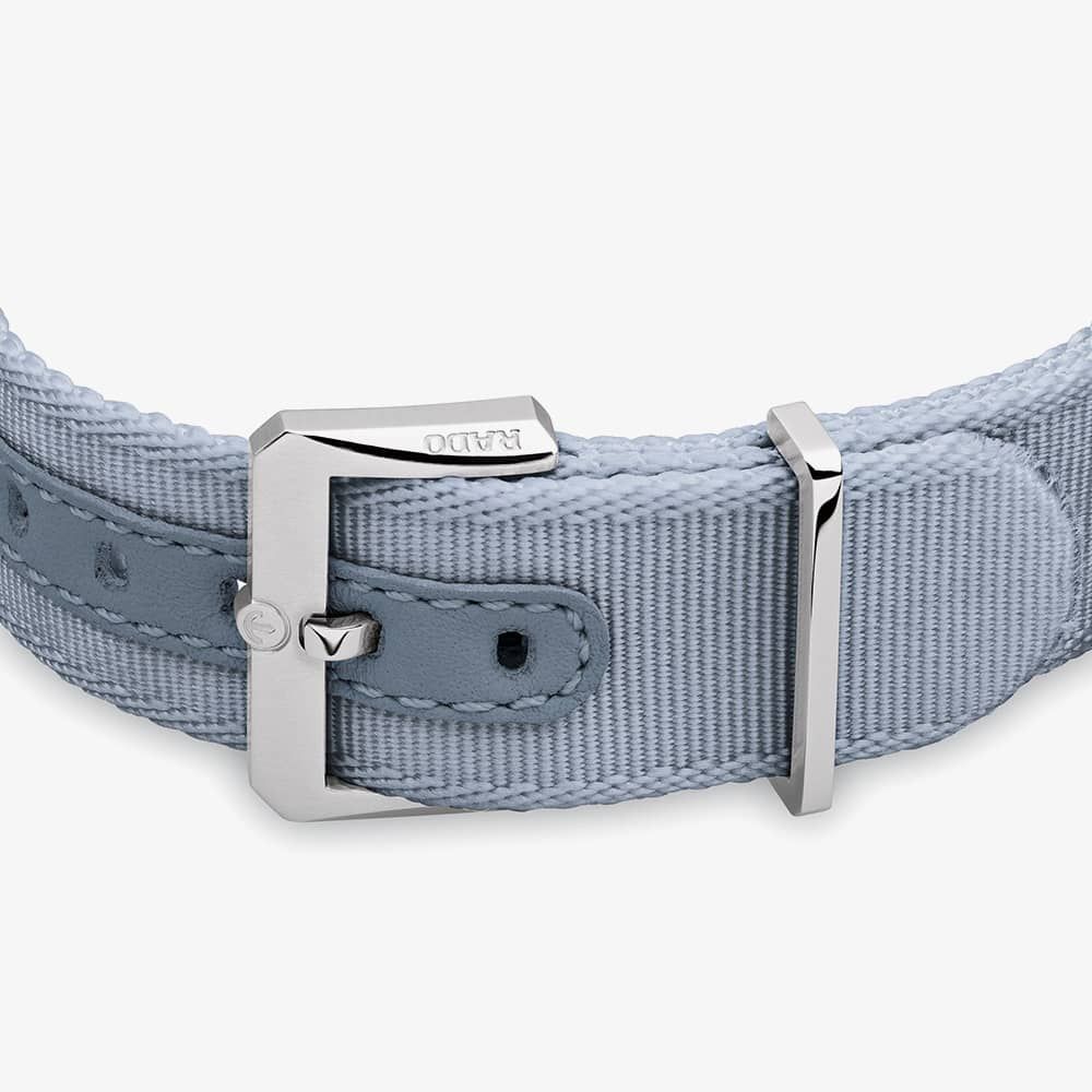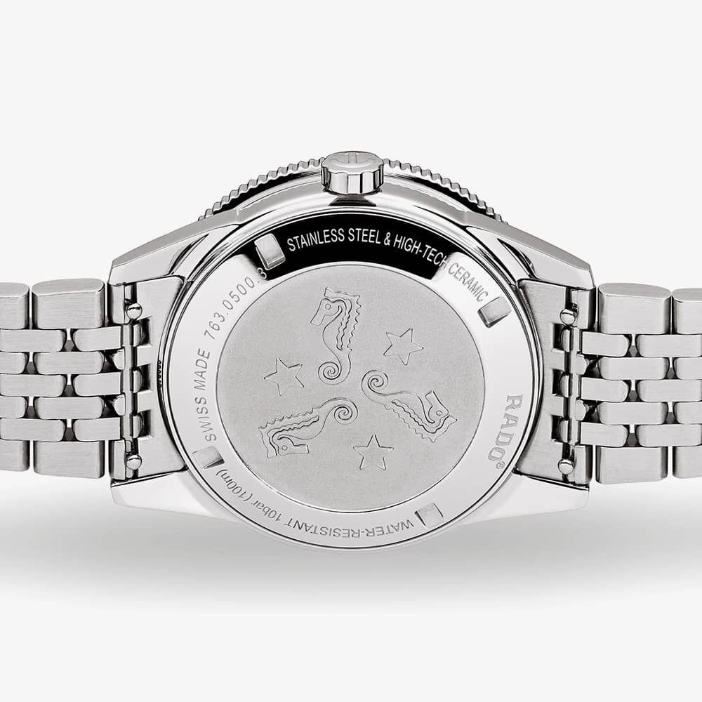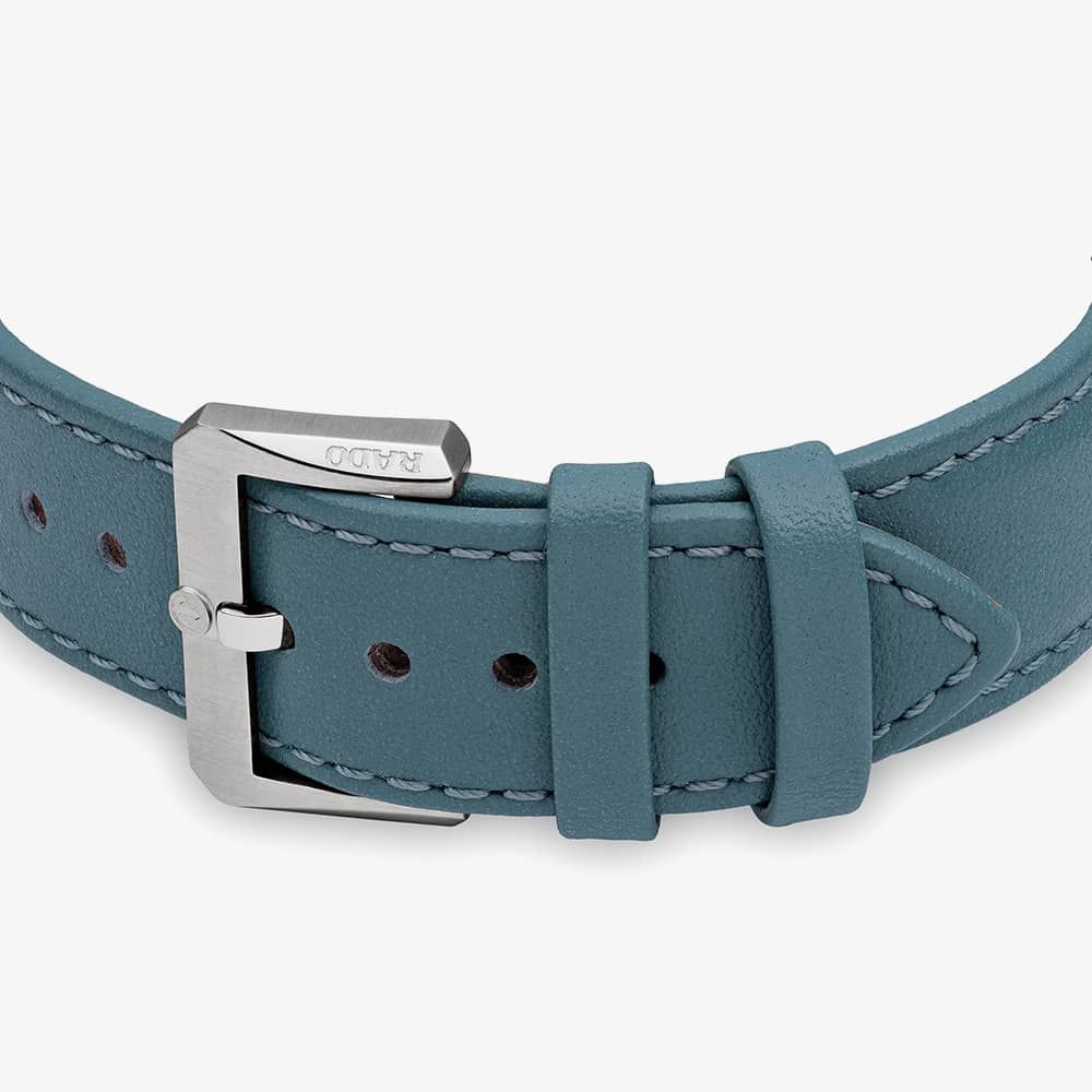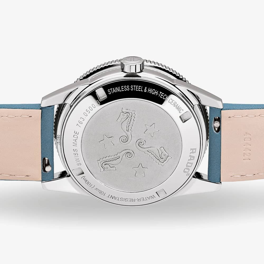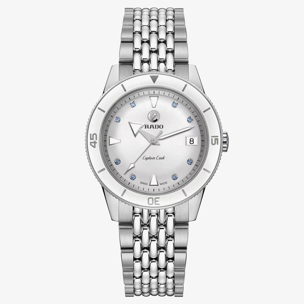 This watch is a modern take on the iconic Rado timepiece. Adorned with eight ice-blue sapphires as hour markers on a pristine white dial, it is framed by a bezel featuring a white high-tech ceramic inlay. This versatile timepiece comes with three straps: a rice grain stainless steel bracelet, a light blue Nato strap, and a blue leather strap with blue stitching. Changing between them is effortless and swift, thanks to Rado’s EasyClip system.
