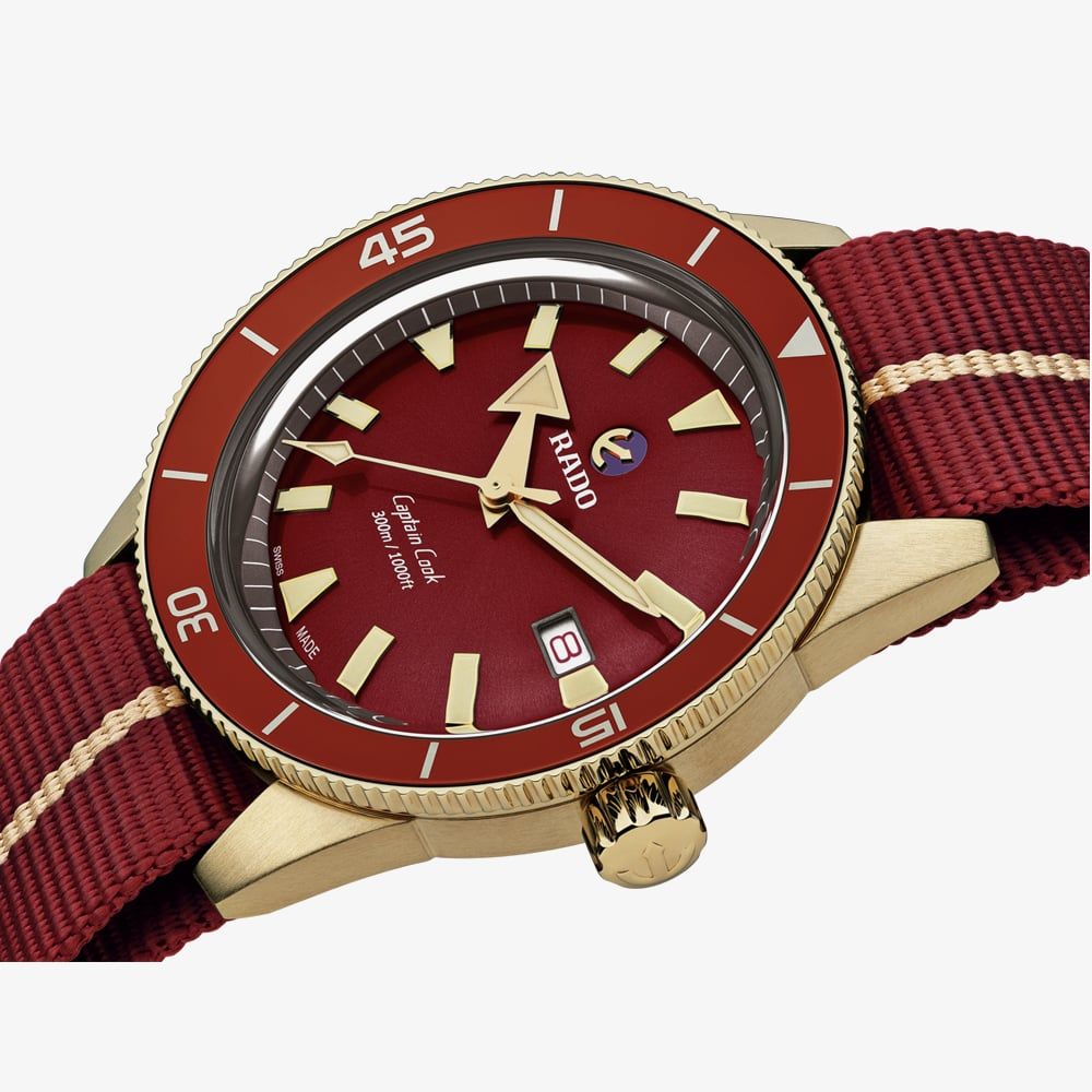The Captain Cook Bronze watch has been reimagined for the twenty first century, with vintage details and up-to-date features this watch has the perfect combination. Featuring a bronze case with a gradient red dial and matching durable synthetic NATO strap.