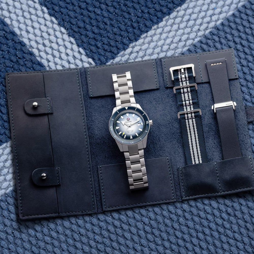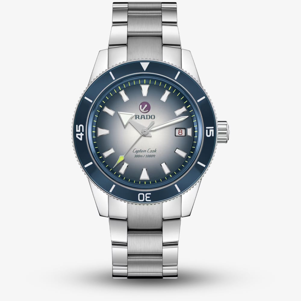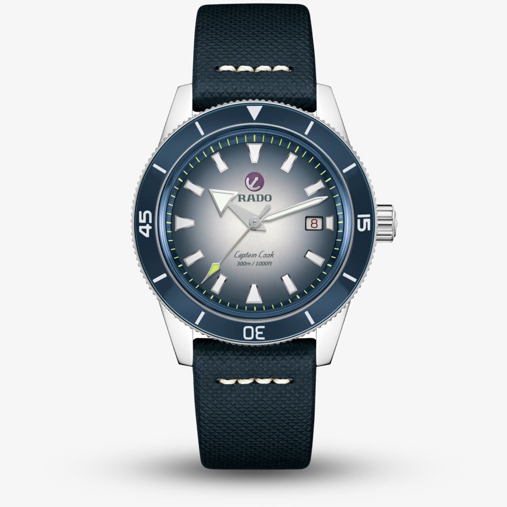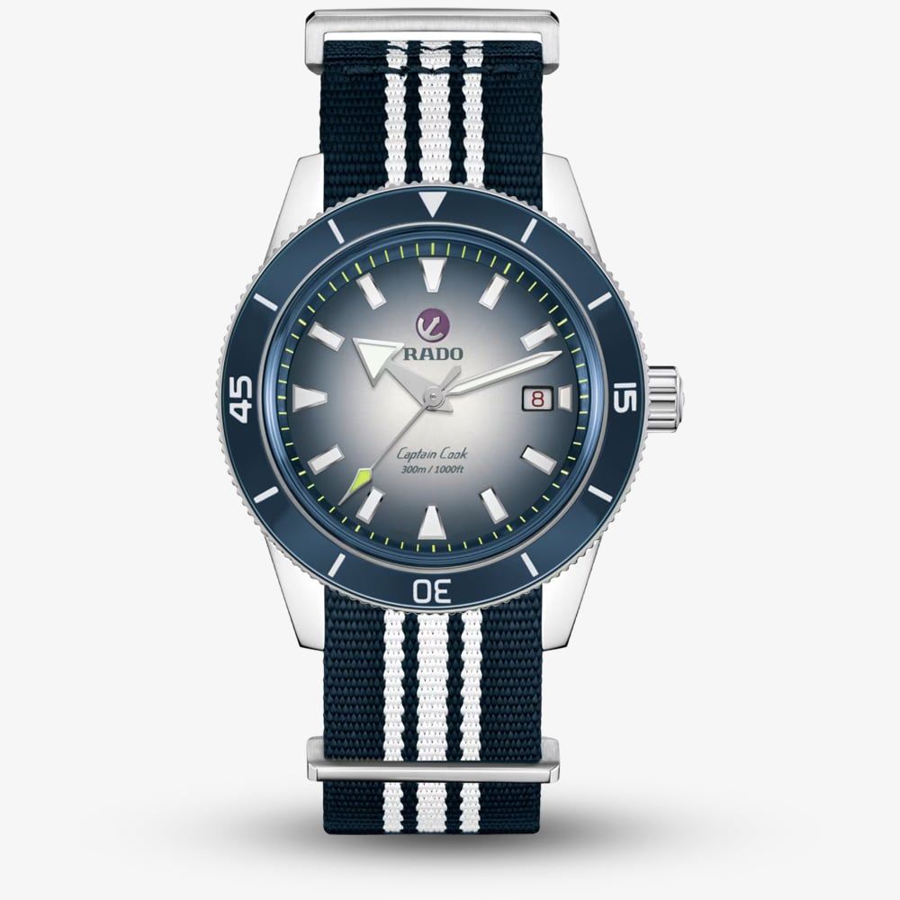The Captain Cook Automatic boasts a 42mm polished stainless-steel case and crown, complemented by a polished stainless-steel rotating bezel featuring a blue high-tech ceramic insert. The bezel is adorned with engraved numbers and markers in matte white Super-LumiNova®. This watch is powered by the Rado calibre R763 automatic movement, offering an impressive 80-hour power reserve. The rhodium-coloured hour and minute hands are coated with white Super-LumiNova®, while the central seconds hand sports a yellow Super-LumiNova® tip, playfully referencing the colour of tennis balls. The Captain Cook Automatic comes with a stainless-steel bracelet and a blue leather pouch. It also offers versatile style options, including a classic blue leather strap and a blue and white NATO-style textile strap.