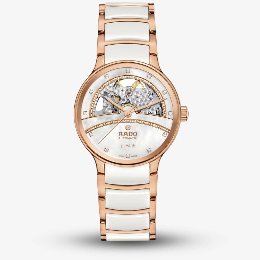Experience the harmonious blend of artistic expression and design stylings with the Rado Centrix Open Heart watch. A captivating window showcases the intricate workings of its cutting-edge automatic movement. The overall appearance of this iconic timepiece is completed with adjusted case lugs and a bracelet made of polished rose-gold-coloured PVD-coated stainless steel with white high-tech ceramic middle links. The white mother-of-pearl dial set with twelve diamond hour markers, echoes with the rose-gold printed "jubilé" logo, which matches perfectly with the hands. The Super Jubilé version adds a further sparkling stream of 86 diamonds along the lower arch of the bridge, as an ultimate statement of love-struck sophistication and finesse.