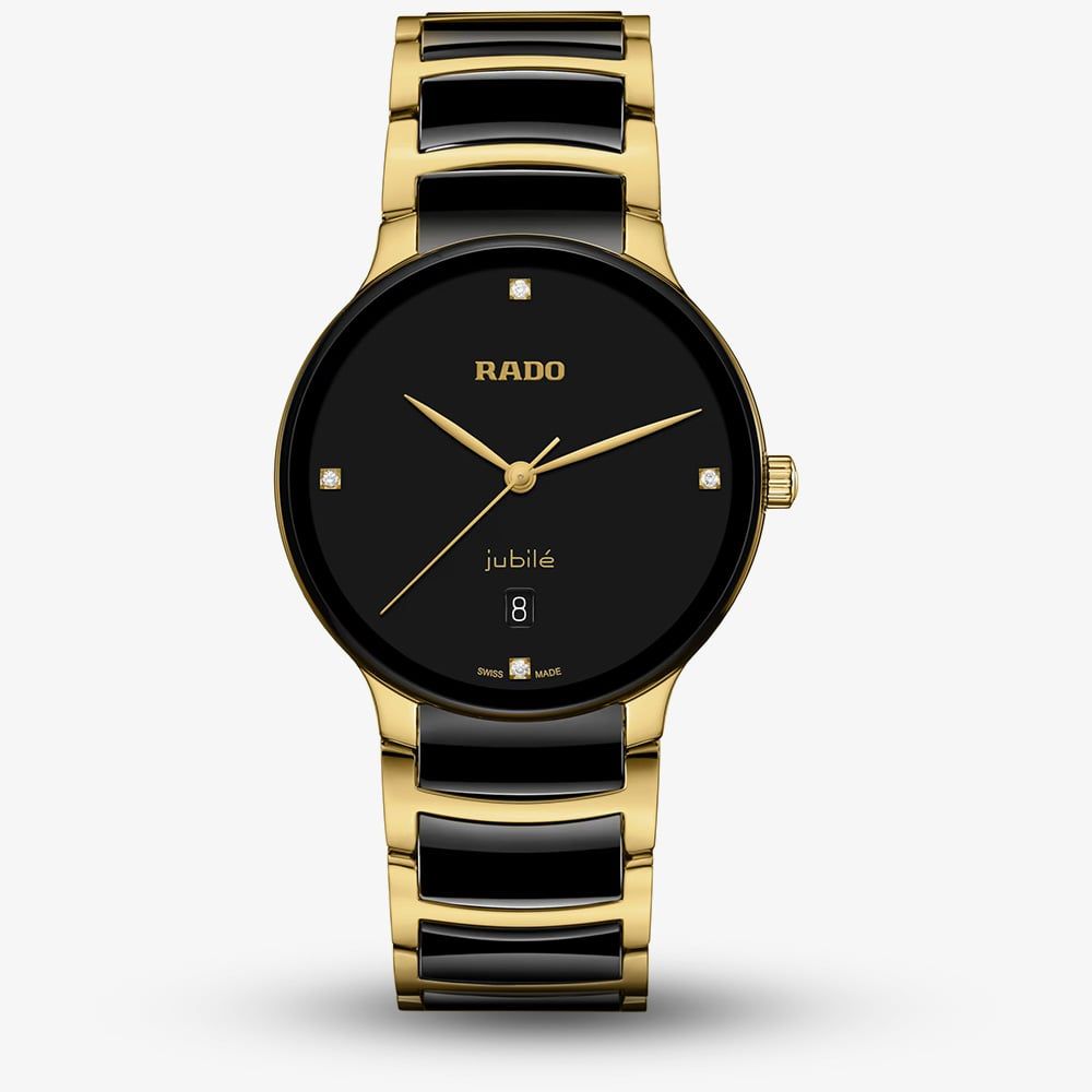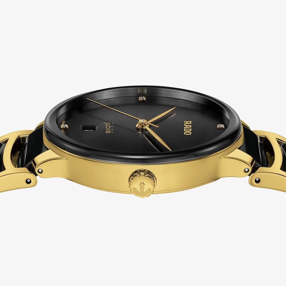 The Centrix Quartz Diamonds watch combines technical and aesthetic upgrades. It features a rounded sapphire crystal, curved case, and a polished yellow gold-tone PVD bracelet with black ceramic links. The black lacquered dial, with four diamonds and a "jubilé" logo, pairs perfectly with yellow gold hands. Powered by the R073 quartz movement with PreciDrive and HeavyDrive for enhanced accuracy and shock resistance, it’s also water-resistant to 50m.