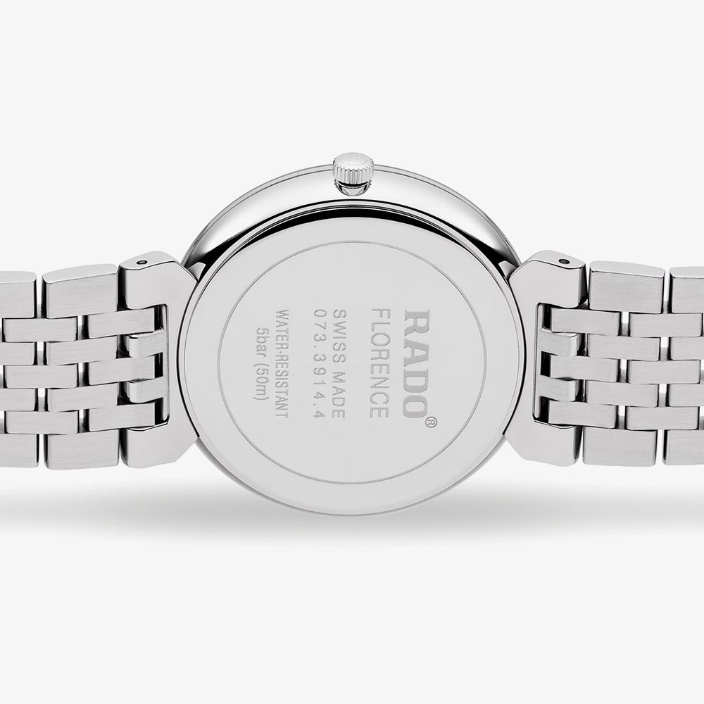 The rado Florence is inspired by the city of Florence with its elegant design. The dial features four cut diamonds as hour markers in the 12,3,6,9 positions.