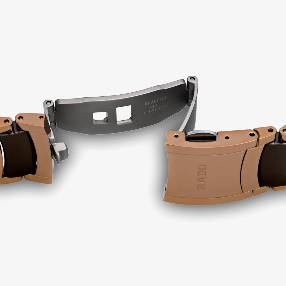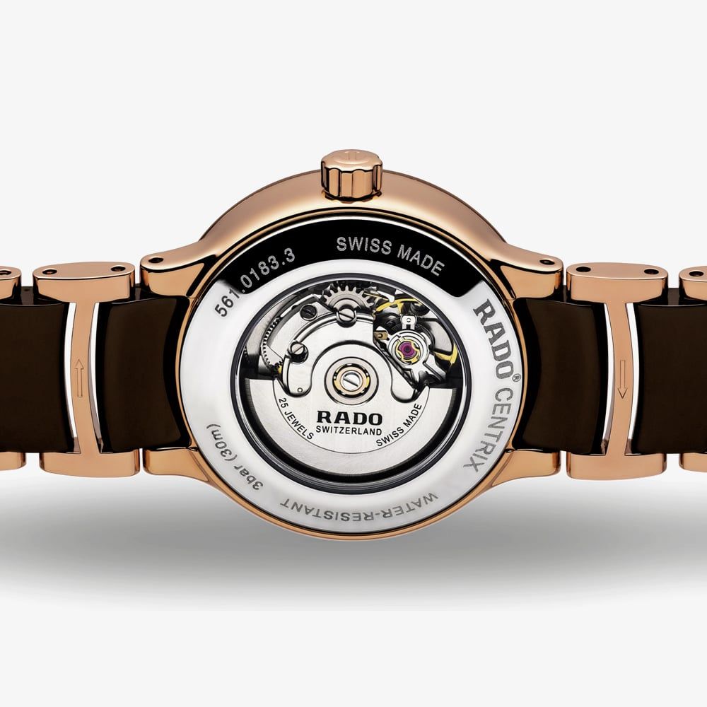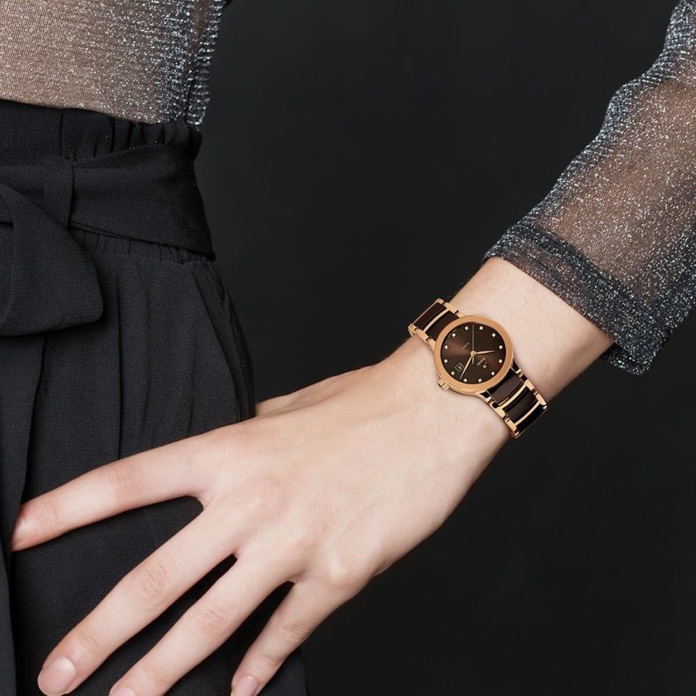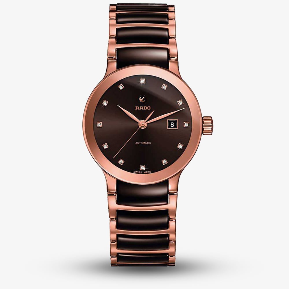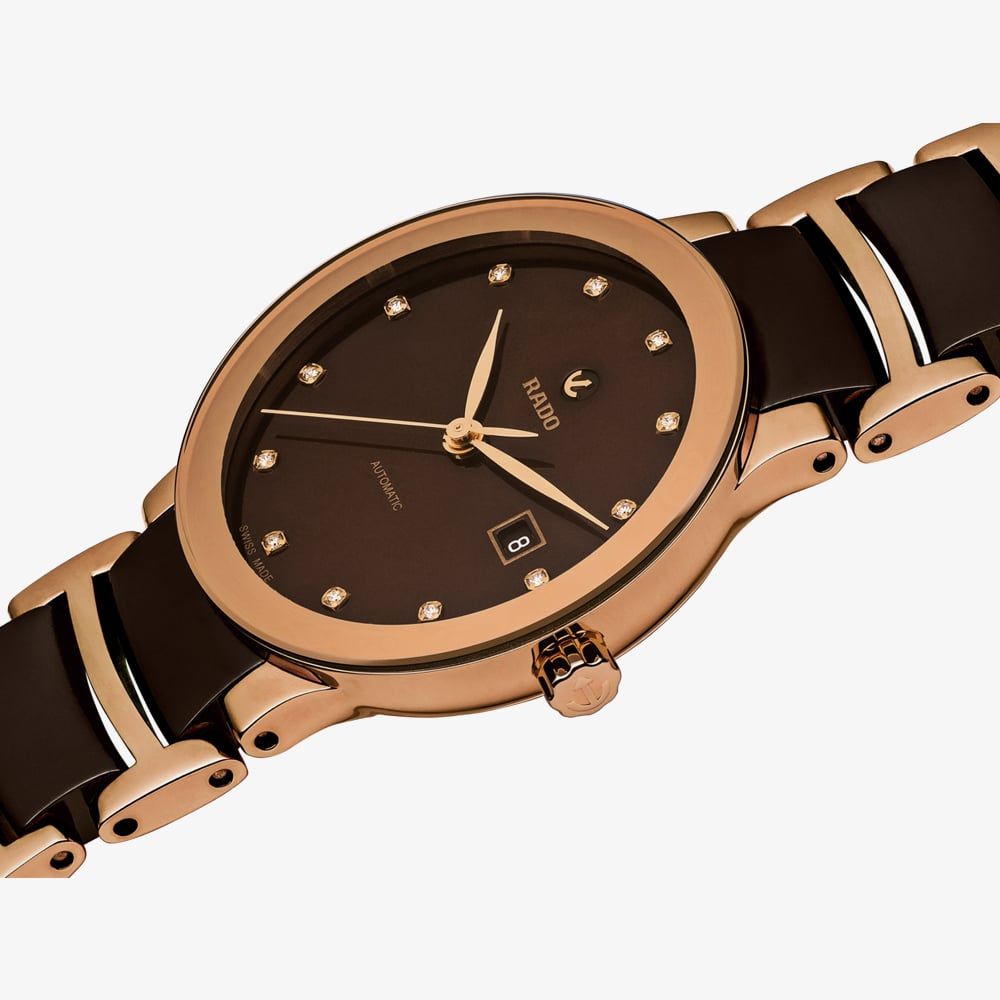 As Rado’s most popular collection, the Centrix series hosts a versatile range of models in varying size and colour combinations. The sapphire crystal protects the brown dial which has rose gold hands and sparkling diamond hour markers in addition to a clear date display.