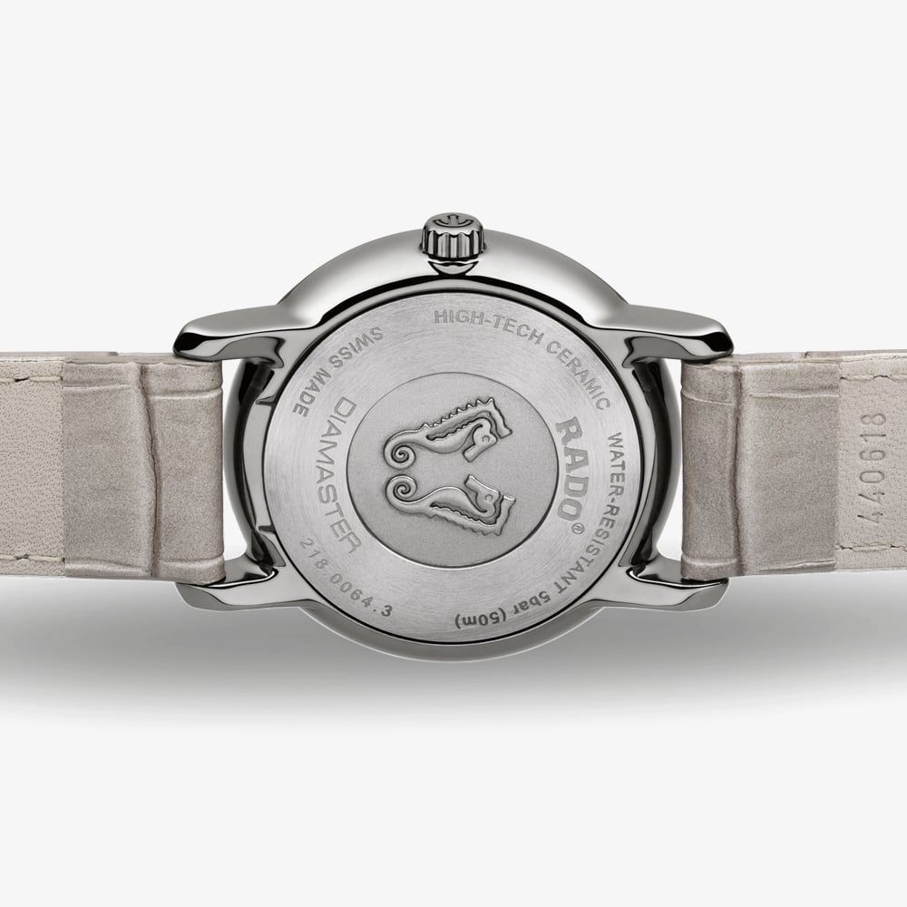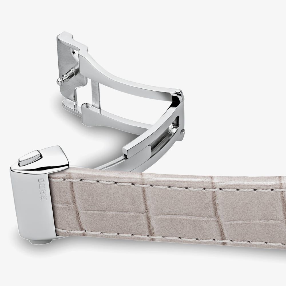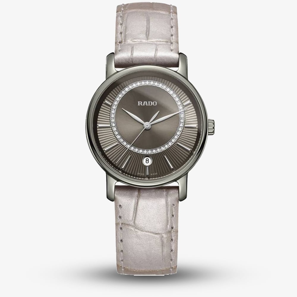 Introducing the DiaMaster from Rado, an attractive leather croc strap watch with classic style redefined for the modern woman. The round silver dial is split into two features- a sunray portion within an off-centre ring of 49 diamonds with a total weight of 0.142ct, and the lined Guilloche background featuring slim hour markers and a round white date window at 6 o'clock.