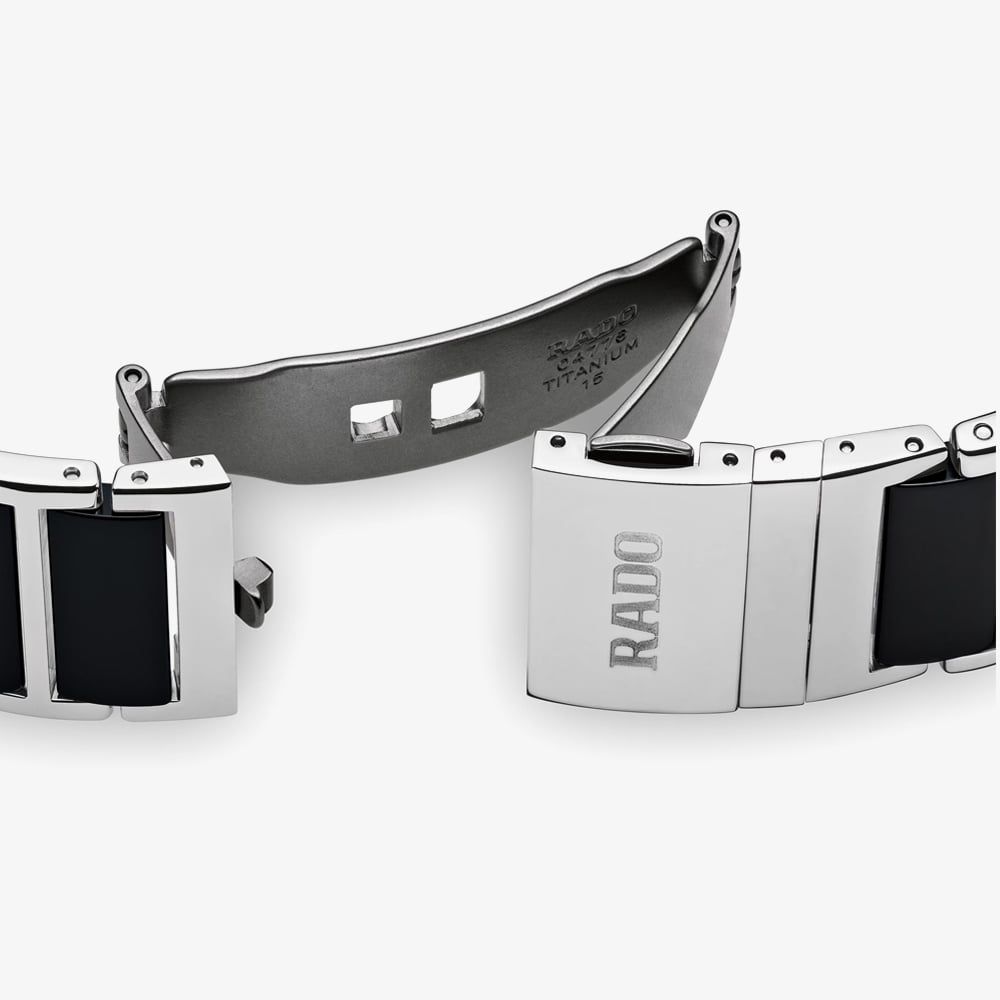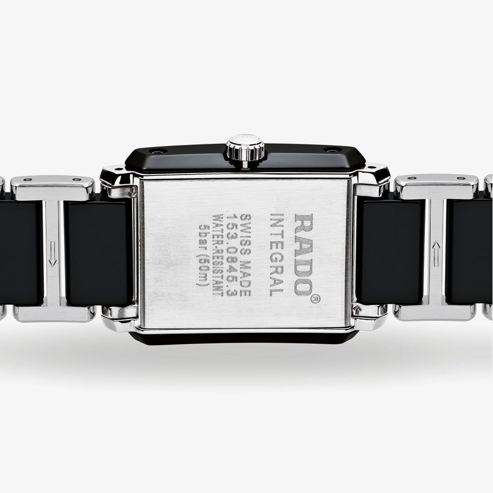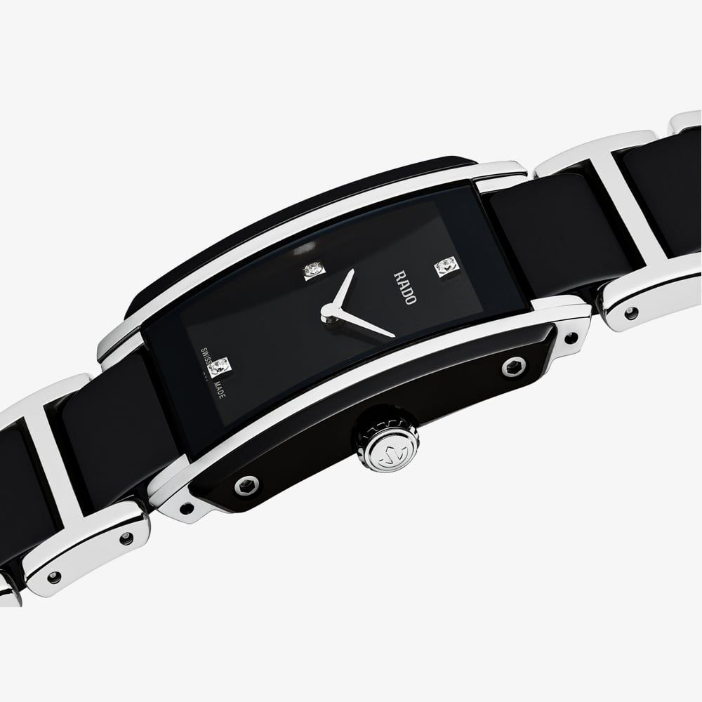 Demonstrating Rado's impeccable craftsmanship, is this contemporary Integral wristwatch crafted from a combination of stainless steel and high-tech ceramic. Its lightweight design makes for a comfortable fit whilst uncompromising style and sophistication. Its minimalist black dial boasts four diamond set hour markers.
