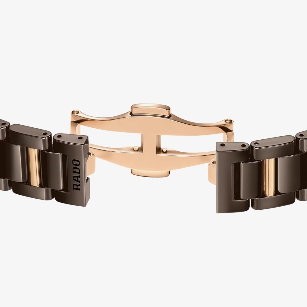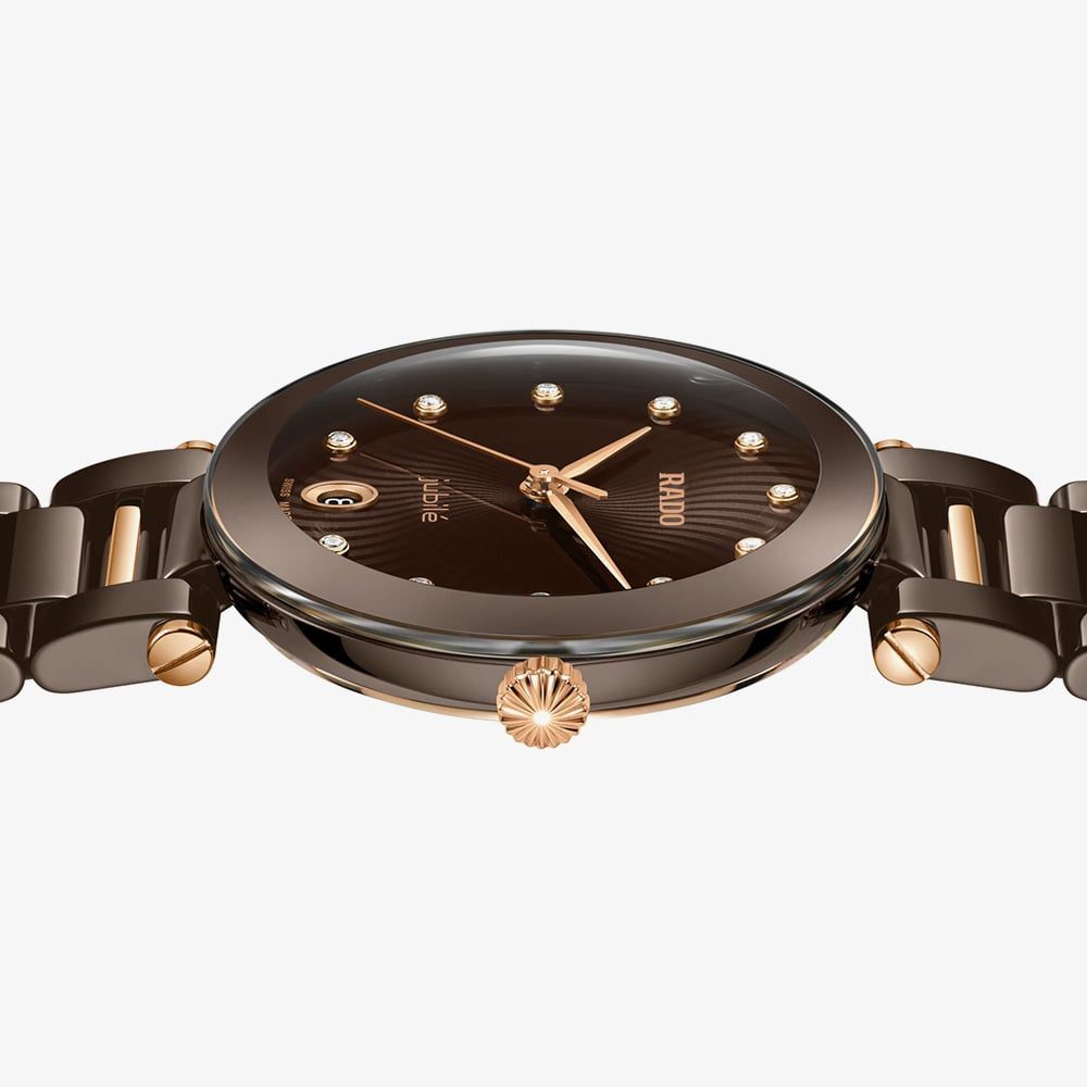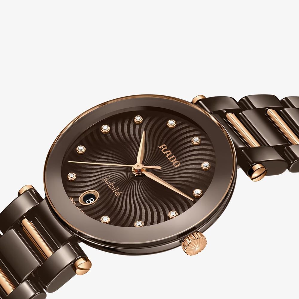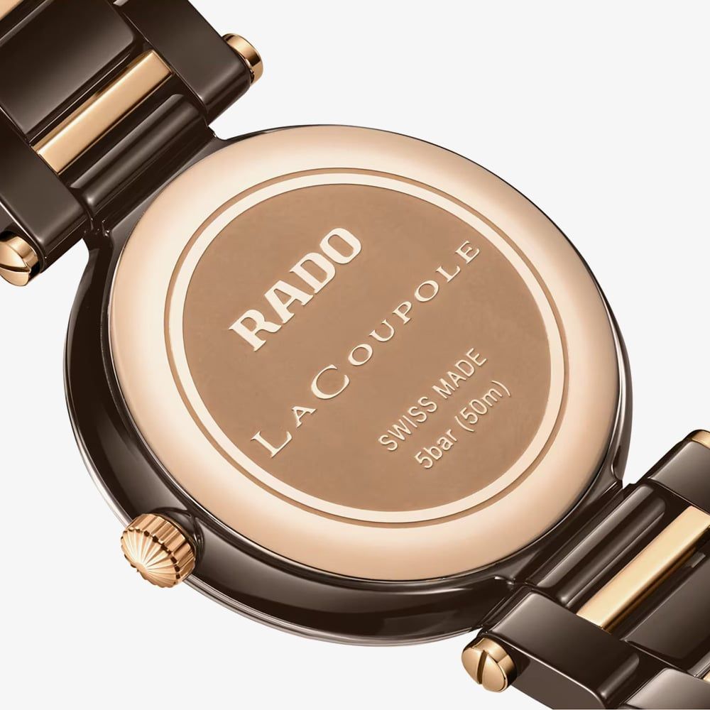 LaCoupole is a sophisticated reinterpretation of classic elegance, crafted for the modern connoisseur. Its 31 mm monobloc case and bracelet, made from polished plasma high-tech ceramic in a rich brown and rose gold finish, exude warmth and refinement. The domed sapphire crystal showcases a brown dial with sculpted wave-like lacquer details, highlighted by 11 Top Wesselton diamonds. Driven by the ultra-precise PreciDrive™ quartz movement, LaCoupole embodies Rado’s signature fusion of innovation, luxury, and timeless design.