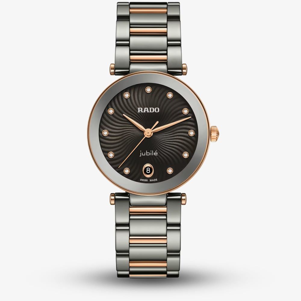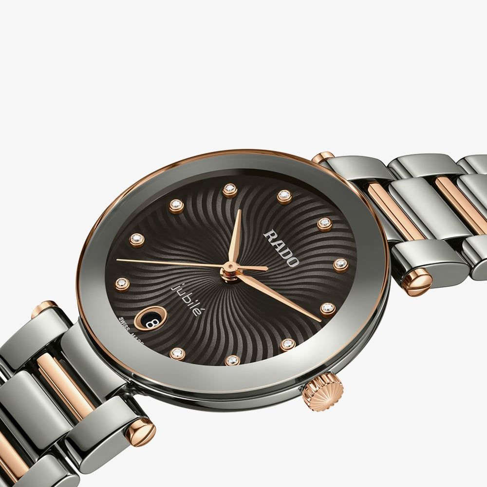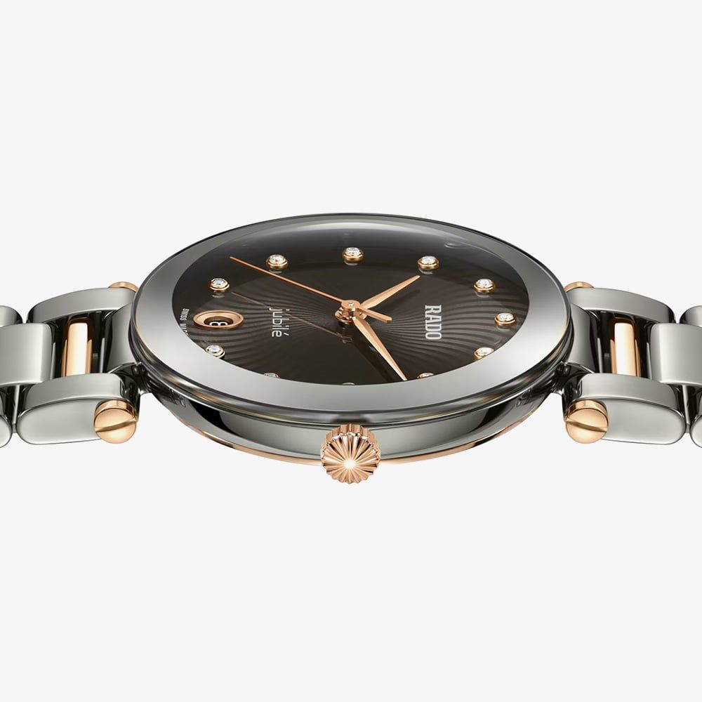 LaCoupole is a contemporary expression of timeless elegance, crafted for those who appreciate refined luxury. Its 31 mm monobloc case and matching bracelet are made from polished plasma high-tech ceramic in a harmonious blend of grey and rose gold tones. A domed sapphire crystal enhances the sculptural form, revealing a grey dial with wave-like lacquered detailing and 11 Top Wesselton diamonds that add a touch of brilliance. At its core, the high-precision PreciDrive™ quartz movement ensures exceptional accuracy.