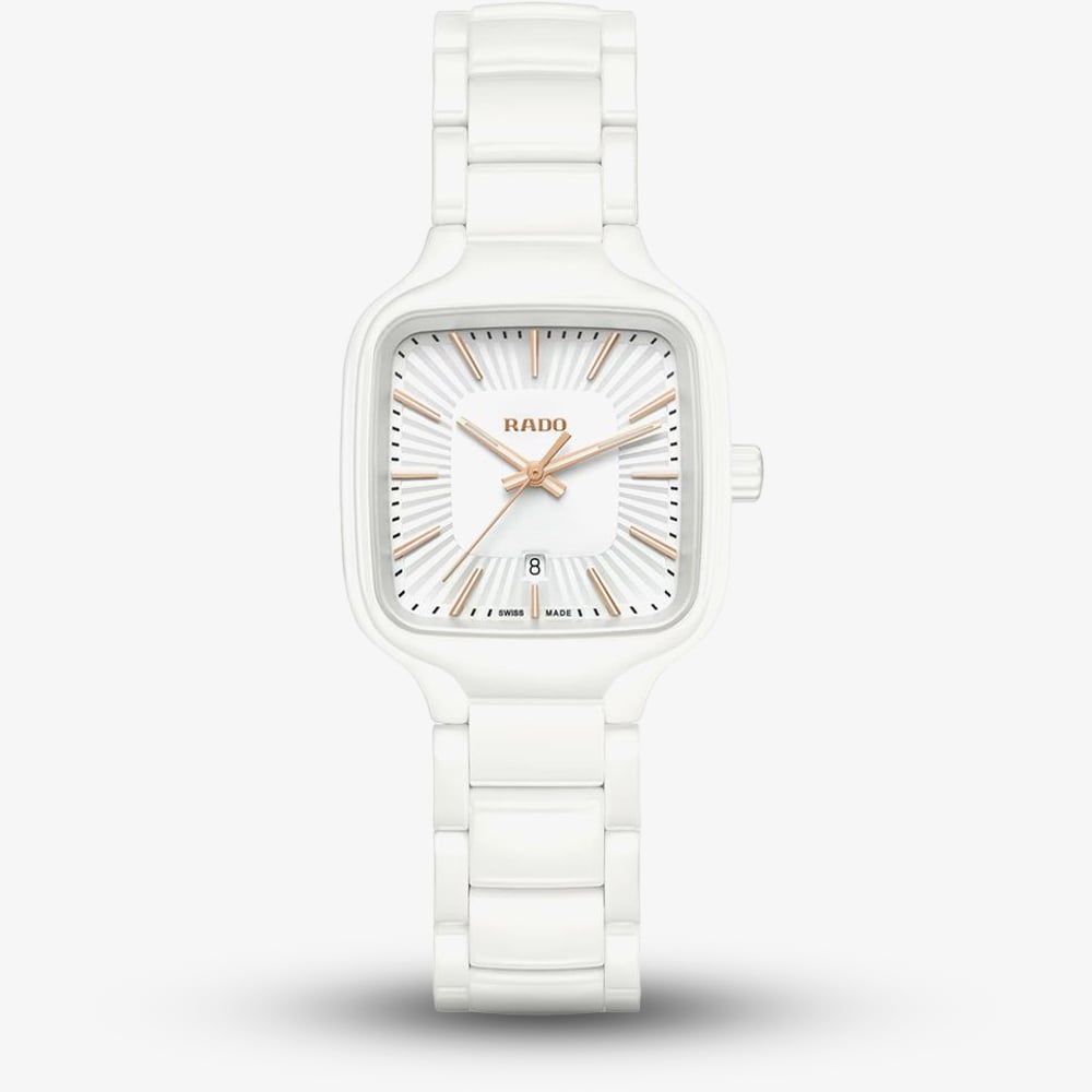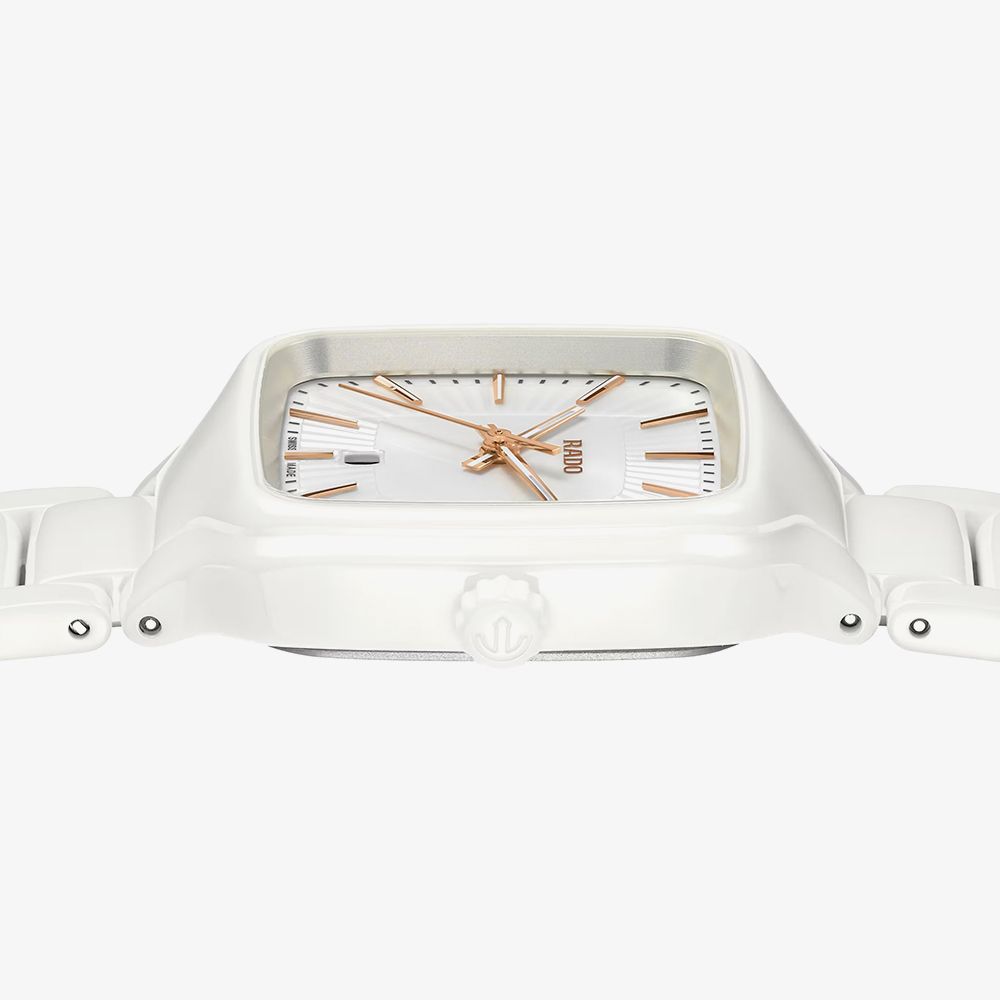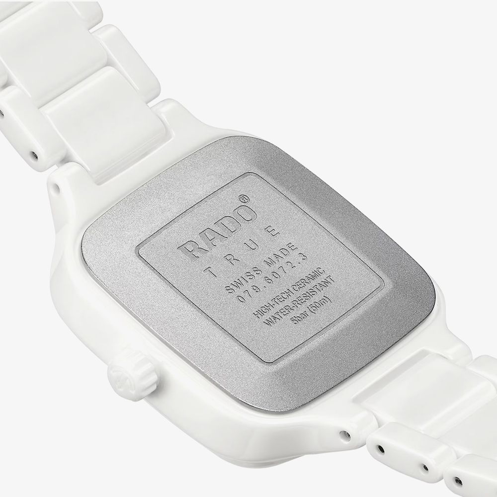 The True square white watch features a polished high tech ceramic case and crown and a flat sapphire crystal glass. The true square also comes with a high-tech ceramic bracelet with a titanium 3 fold clasp