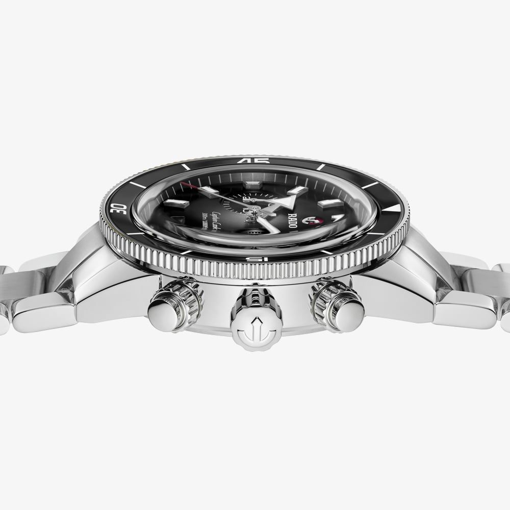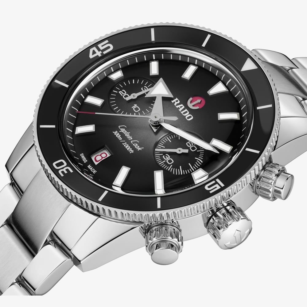 The Captain Cook Chronograph showcases a silver-to-black gradient dial with indexes and hands that are treated with Super-Luminova® with a complementing black high-tech ceramic inlay bezel to frame. The movement has been equipped with an anti-magnetic Nivachron™ hairspring that has been fully tested.