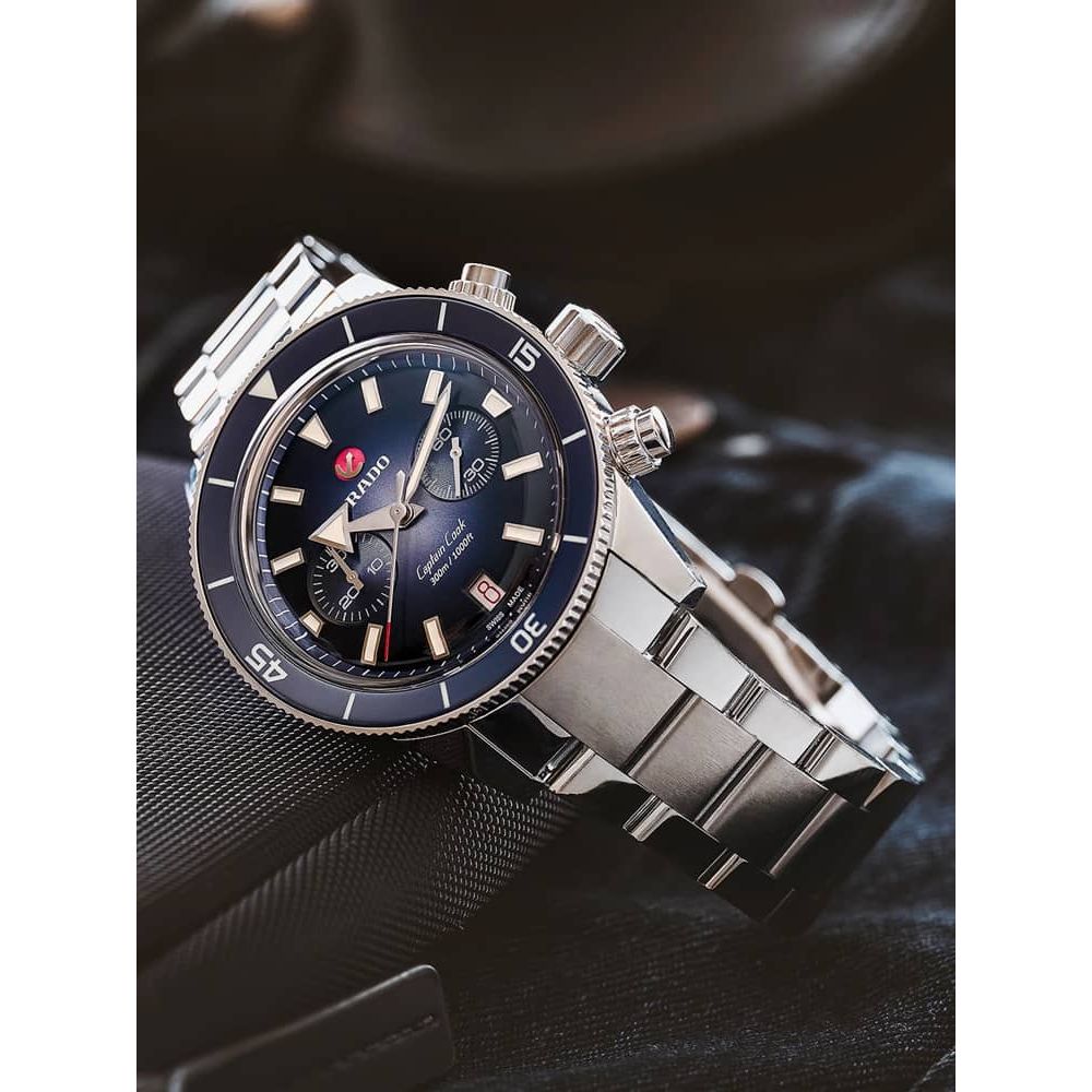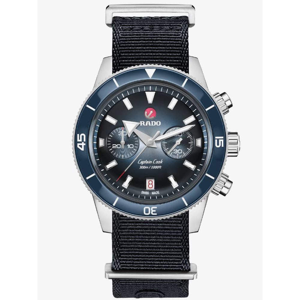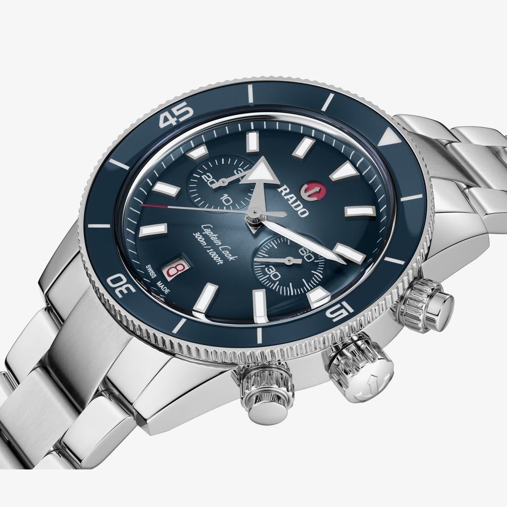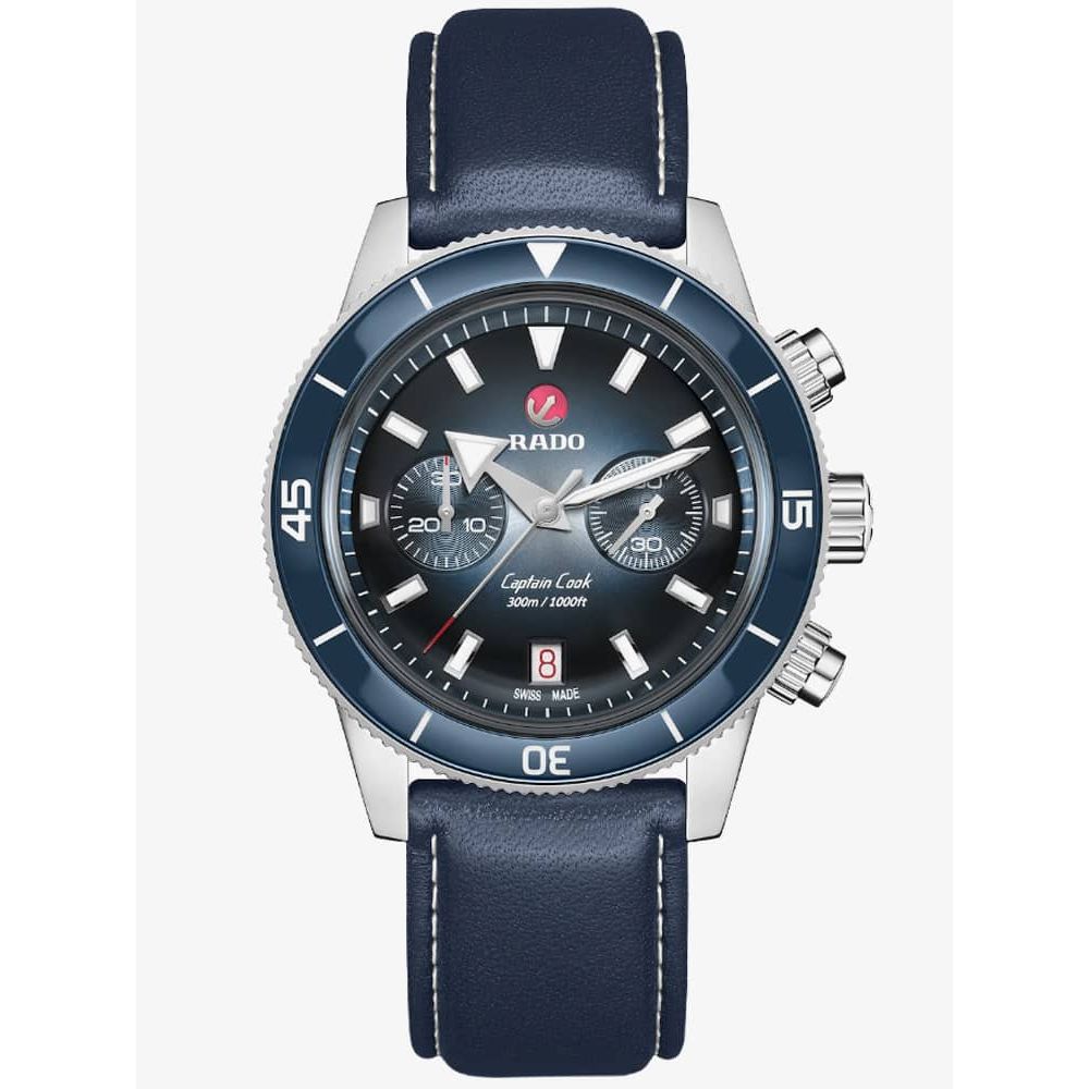 The Captain Cook Chronograph showcases a silver-to-blue gradient dial with indexes and hands that are treated with Super-Luminova® and a complementing blue high-tech ceramic inlay bezel to frame.The movement has been equipped with an anti-magnetic Nivachron™ hairspring that has been fully tested.