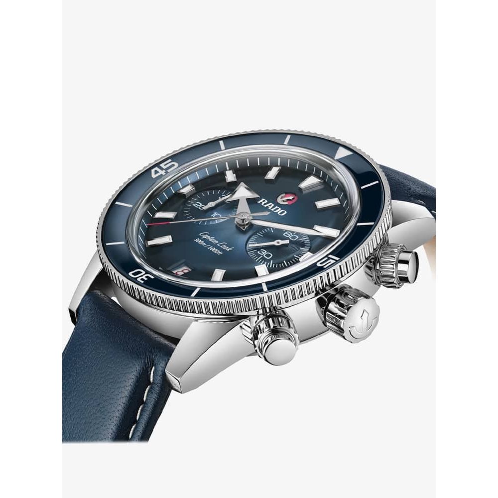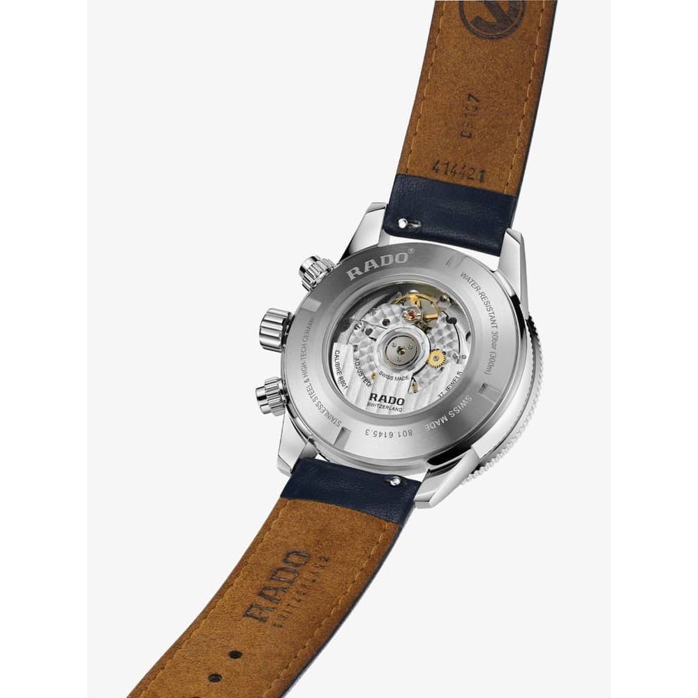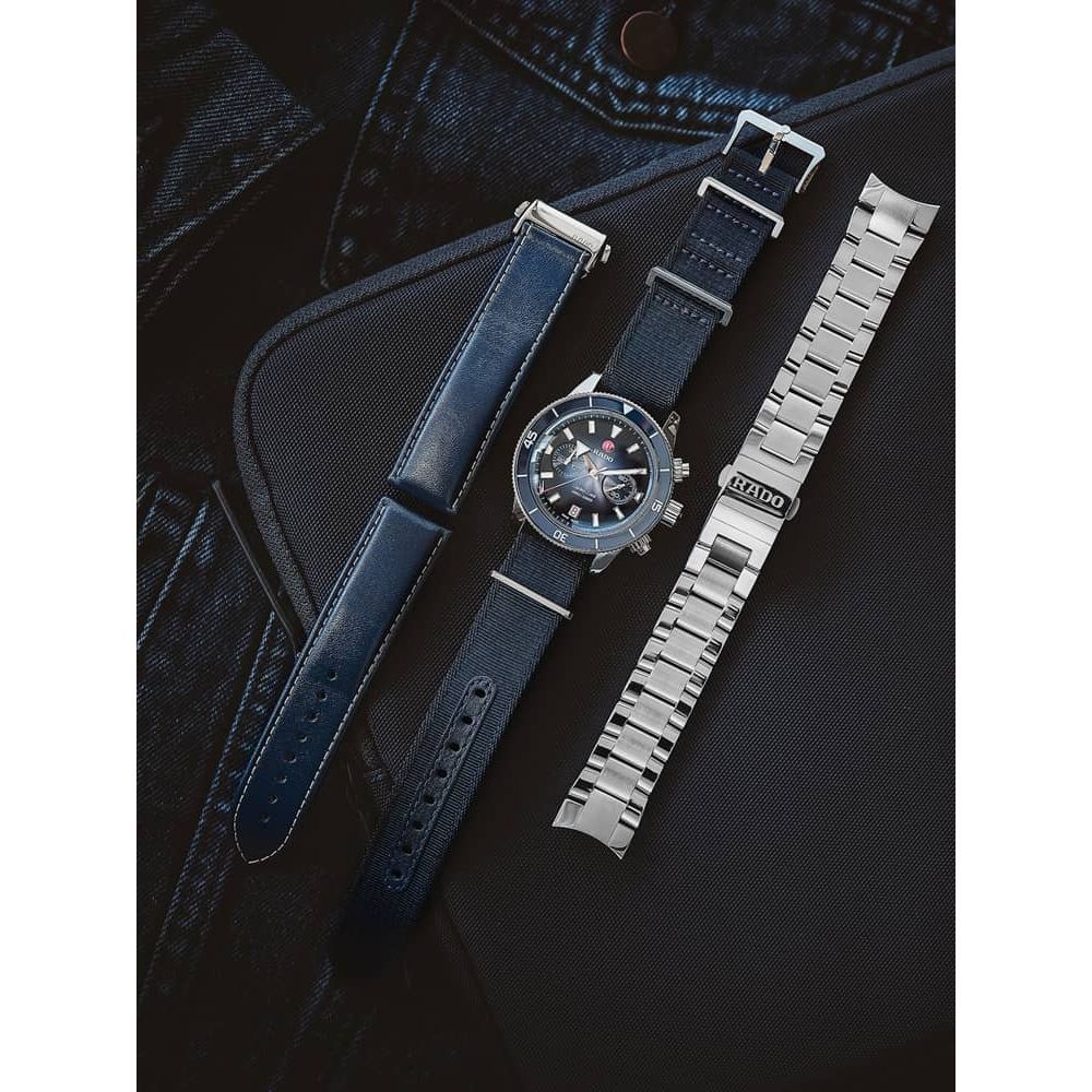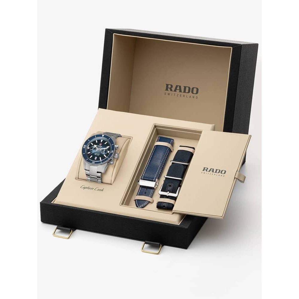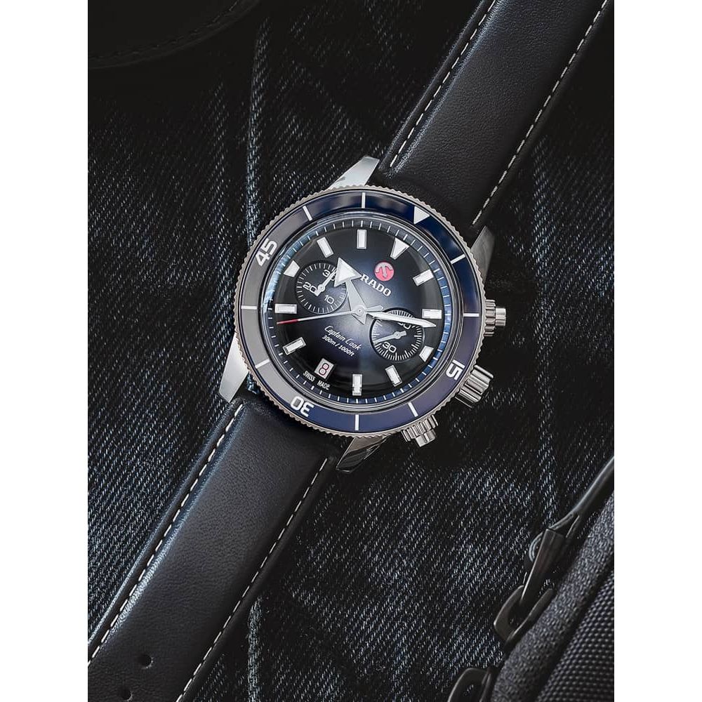 The Captain Cook Chronograph showcases a silver-to-blue gradient dial with indexes and hands that are treated with Super-Luminova® and a complementing blue high-tech ceramic inlay bezel to frame.The movement has been equipped with an anti-magnetic Nivachron™ hairspring that has been fully tested.