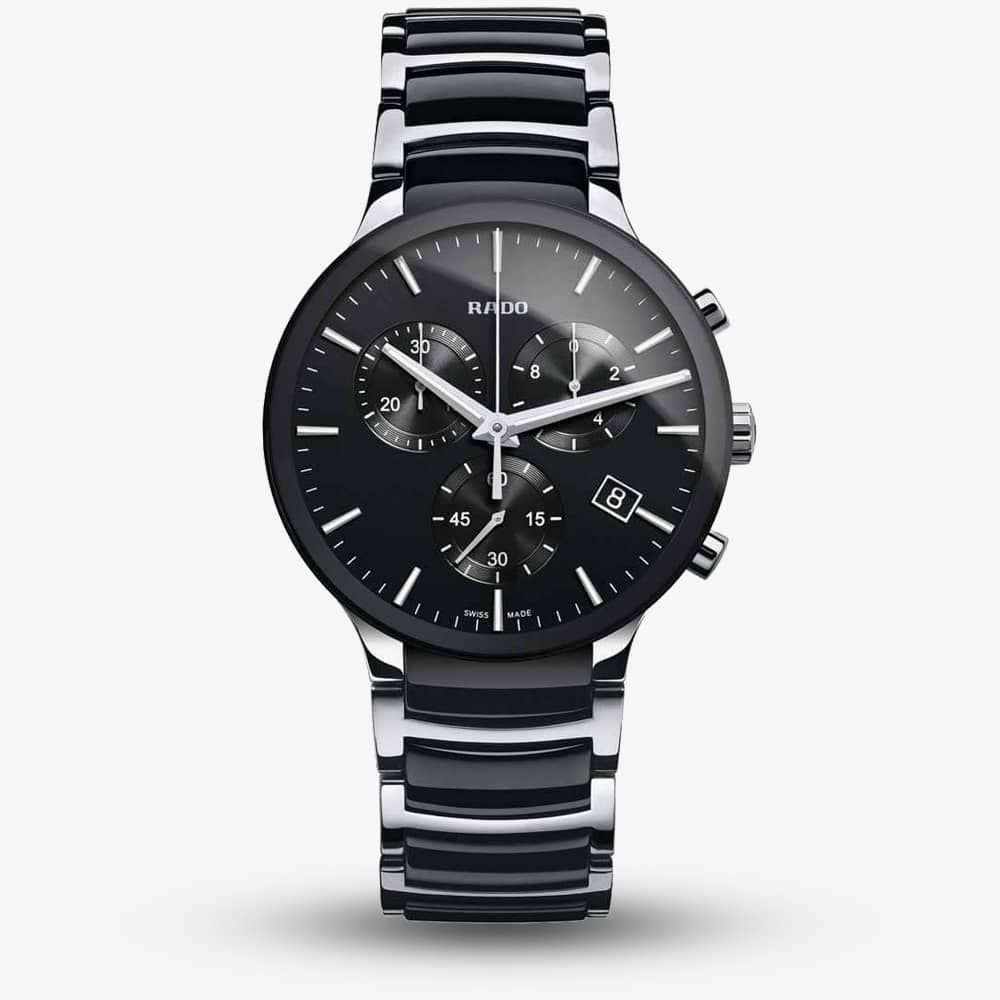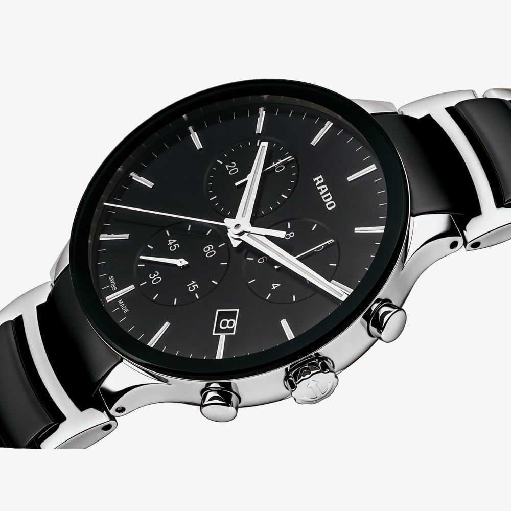 The sporty and versatile Centrix Chronograph watch has been designed to look good for life. This watch boasts a sleek black dial with silver tone chronograph sub dials, luminescent hands, hour markers and a clear date display with a matching High-Tech Ceramic bezel to frame.