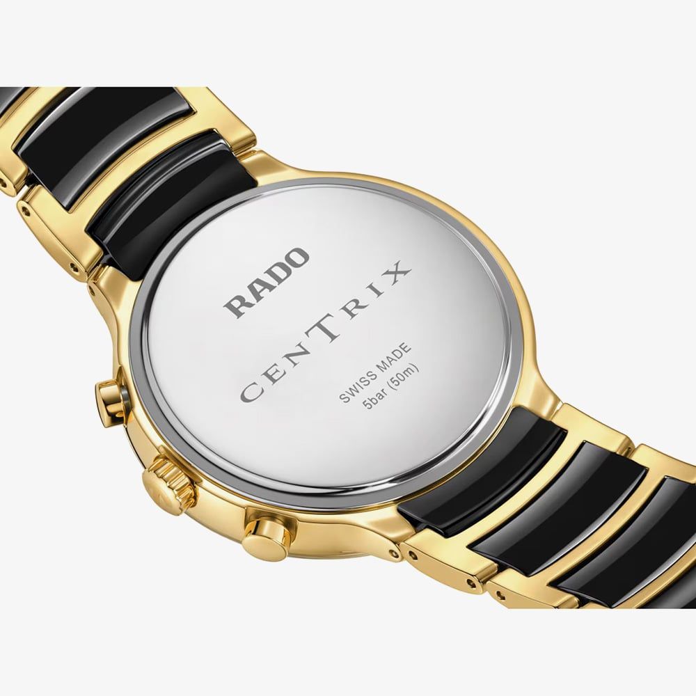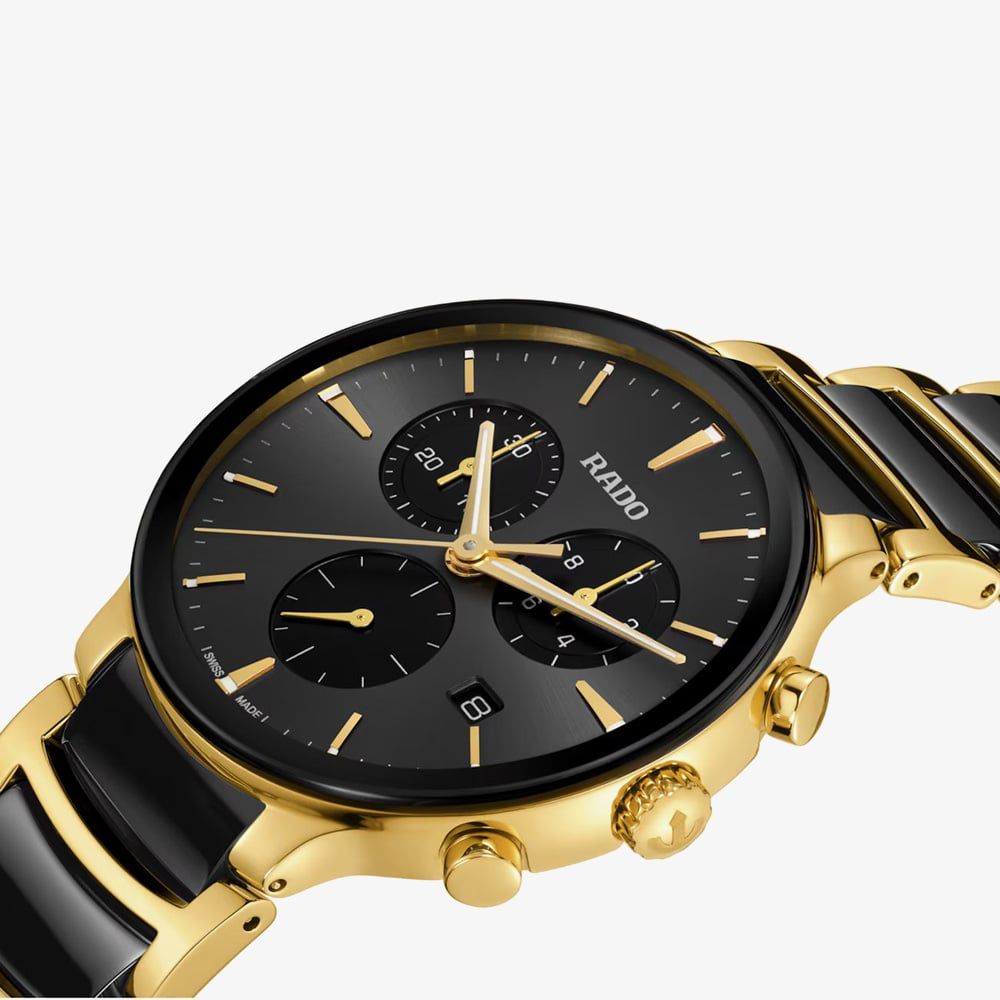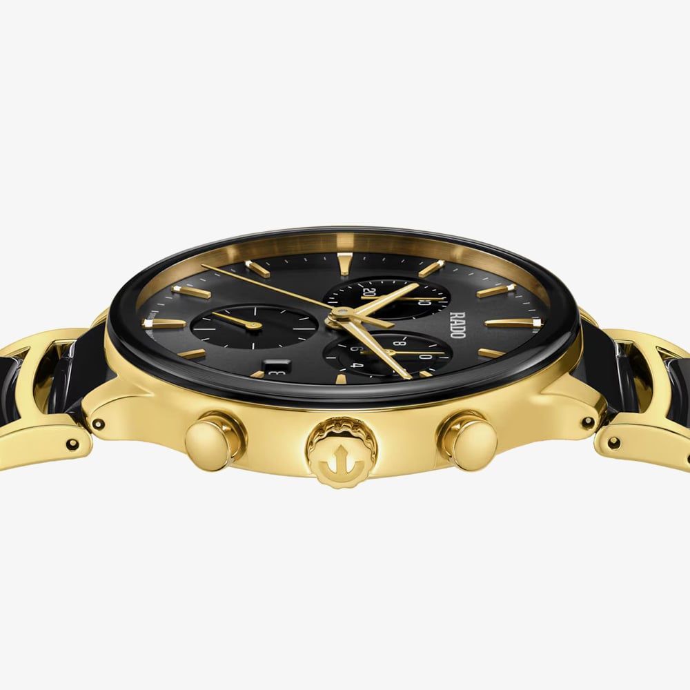 Elevate your style with the Centrix Chronograph, a bold fusion of luxury and precision. Featuring a 41 mm yellow gold-coloured PVD-coated case and a curved sapphire crystal with anti-reflective coating, it delivers standout elegance and clarity. Powered by the ultra-accurate Calibre R312 quartz movement with Precidrive and Heavydrive technologies, it offers chronograph functionality with refined precision. The black sunray dial, gold-tone indexes with Super-LumiNova, and sleek ceramic-accented bracelet complete this sophisticated, high-performance timepiece.