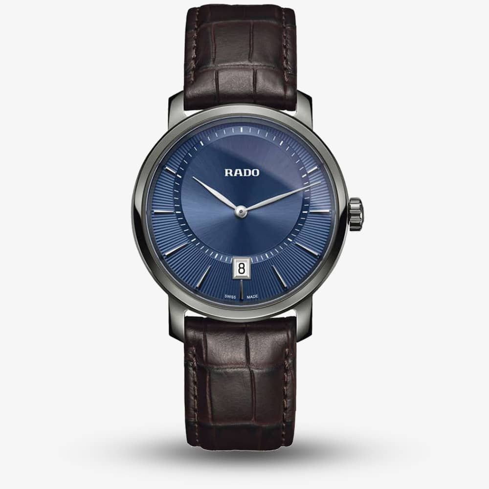 Introducing the DiaMaster from Rado, an attractive leather croc strap watch with classic style redefined for the modern man. The round blue dial is split into two features- a blue sunray portion within an off-centre ring, and the lined Guilloche background featuring slim hour markers and a clear date display positioned at 6 o'clock.