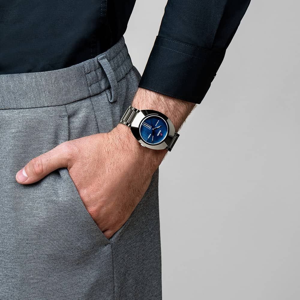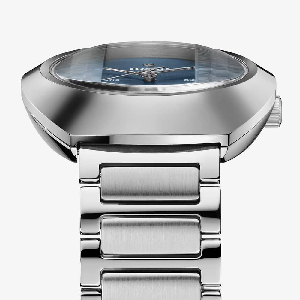 The Diastar Original is a beautiful addition to the original line up. Framed by a ultra shiny ceramos coiffe with polished angles and detailing set over a matching monochrome stainless steel case.the dial is a blue brushed dial with two different directions.