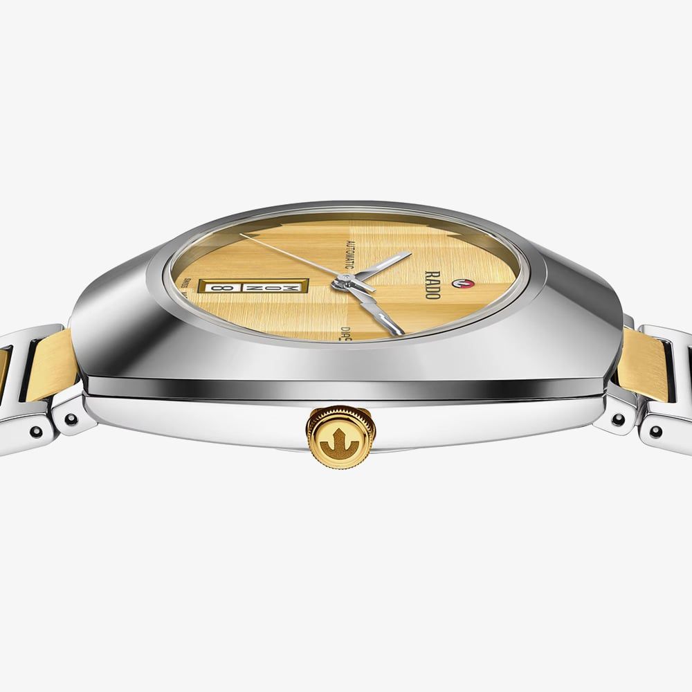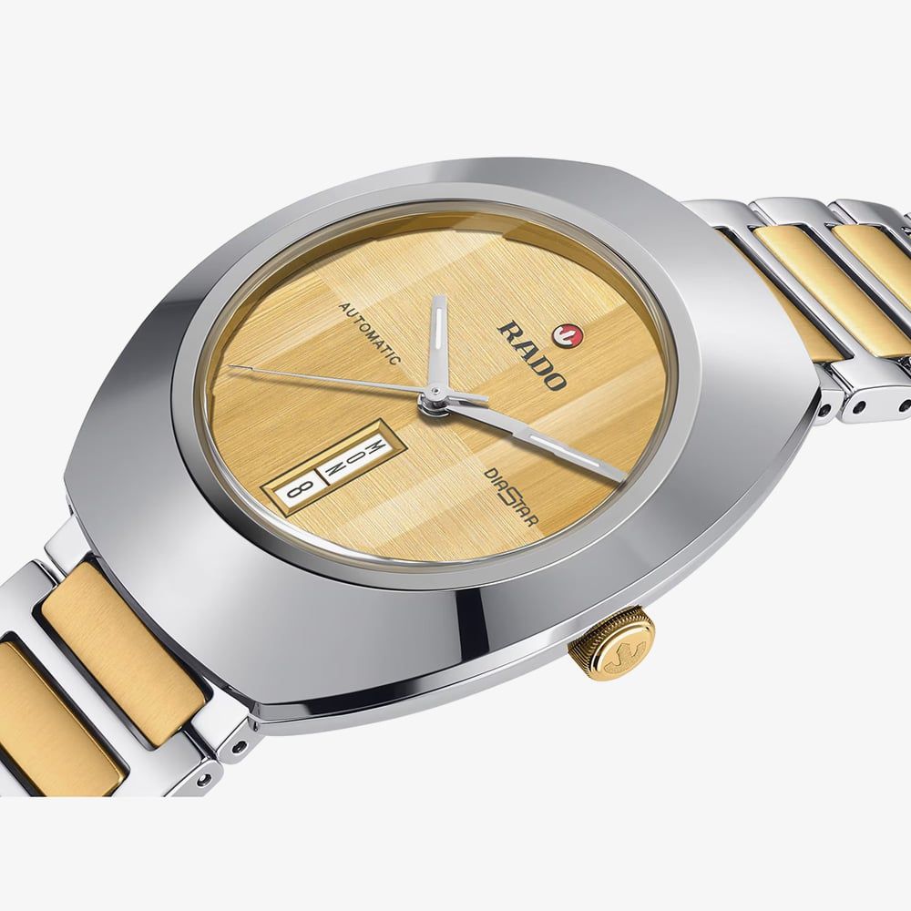Rado’s DiaStar Original R12160253 presents a confident blend of modern materials and refined Swiss watchmaking. The 38mm stainless steel case is topped with an ultra-shiny Ceramos coiffe, its polished angles catching the light with a smooth, glass-like sheen. Beneath the faceted sapphire crystal, the gold brushed dial reveals subtle directional textures that shift as the wrist moves, complemented by rhodium-coloured hands filled with white Super-LumiNova for clear legibility. A neatly framed day and date display adds everyday practicality, while the overall monochrome palette is lifted by warm golden tones.