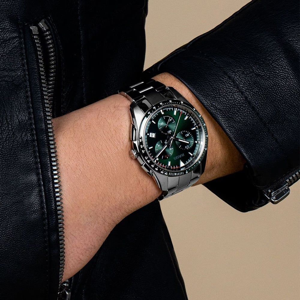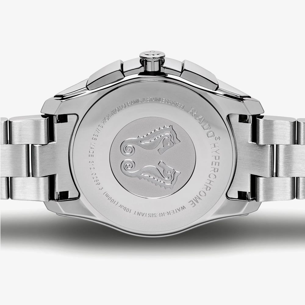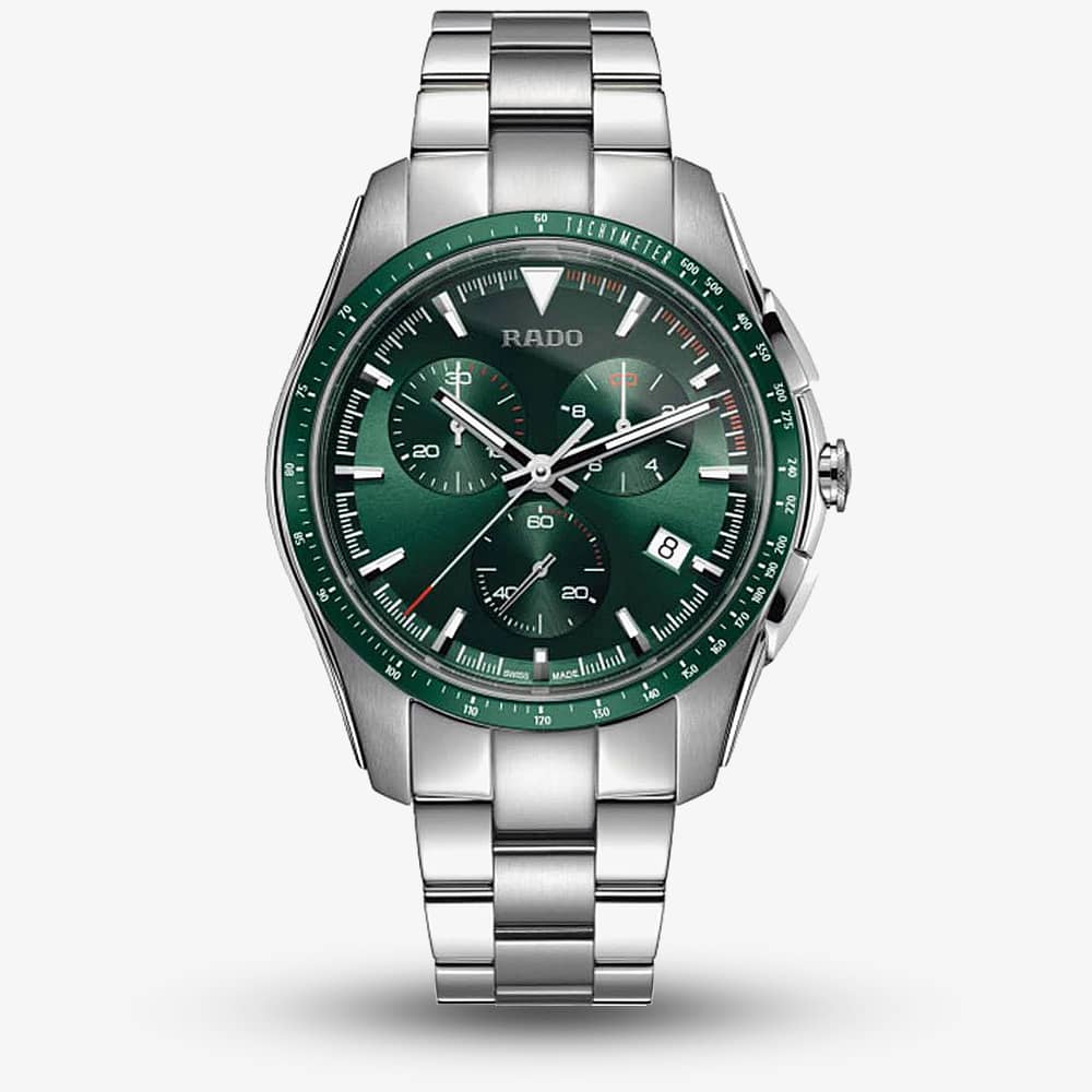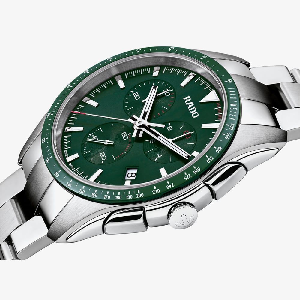 Rado presents this stylishly designed and expertly crafted piece from the HyperChrome collection. This watch boasts a green sunray backdrop that matches the bezel, decorated with pointed silver tone batons and a trio of luminescent dial hands. Alongside hours, minutes and seconds, the dial also possesses a handy date display located to the right of the dial hands, offering an excellent everyday feature.
