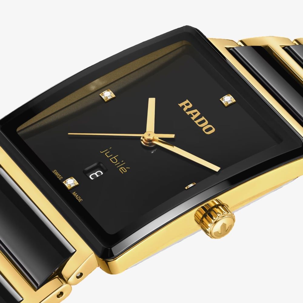 A luxurious timepiece that blends both style and precision, its bold square dial, finished in deep black, is elevated by sparkling diamond hour markers that introduce a touch of luxury. Gold-tone accents further enhance the dial and bracelet, creating a sophisticated contrast. Crafted from stainless steel with high-tech ceramic inserts, the case and bracelet offer a balance of durability and comfort. Stylish, resilient, and impeccably detailed, this watch is a striking statement piece.