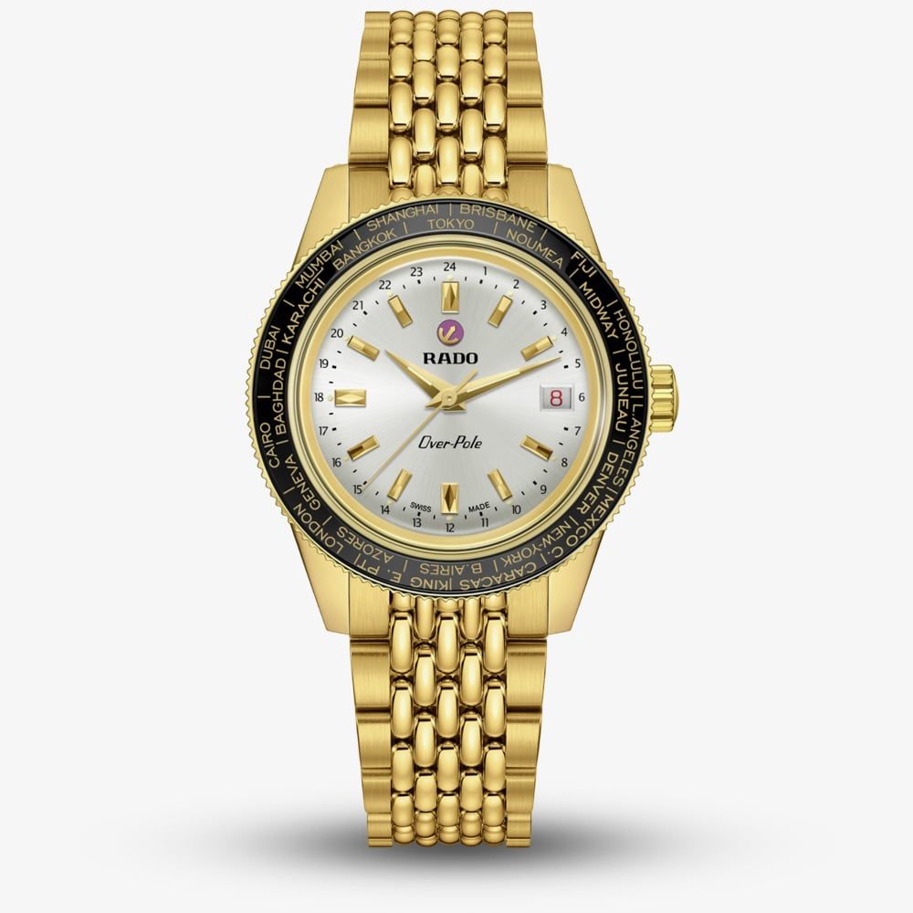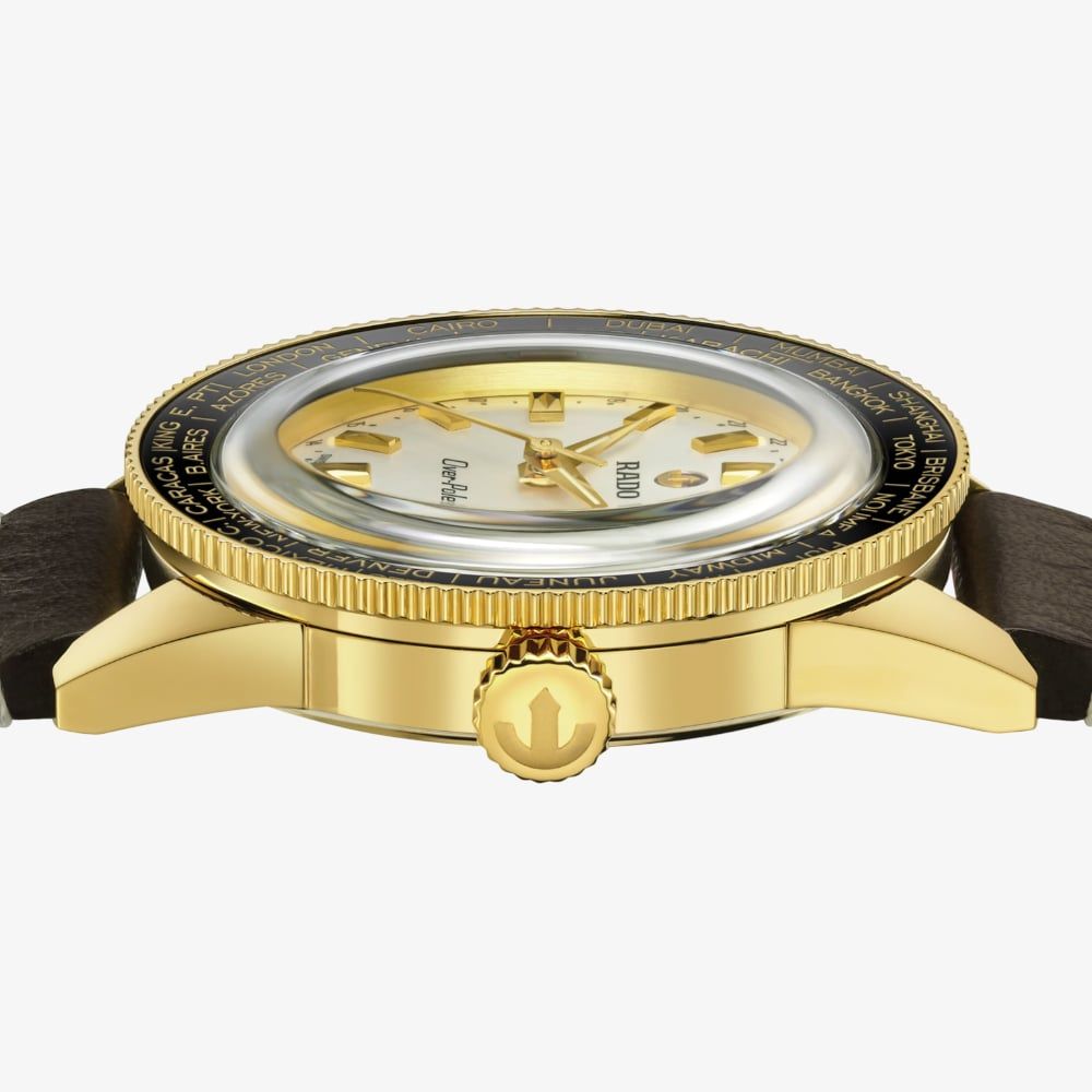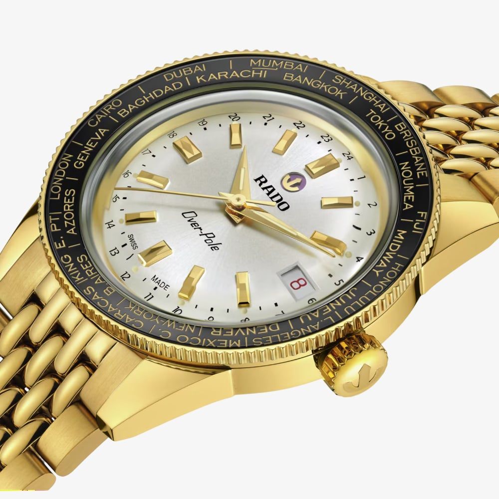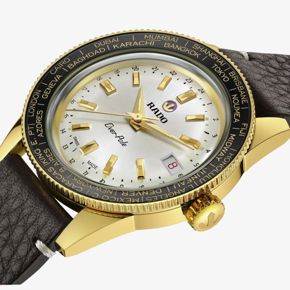 A captivating timepiece that blends vintage inspiration with modern watchmaking prowess. This meticulously crafted watch pays homage to Rado's rich heritage, reimagining a classic design. The watch features a distinctive 38 mm polished stainless steel case, offering comfortable wear. A standout element is the rotating internal bezel with the names of 24 world cities, allowing for easy tracking of a second time zone. This watch is presented on a supple brown vintage-look leather strap with a stainless steel pin buckle, providing both comfort and a classic aesthetic, but also comes with a stylish yellow gold tone stainless steel bracelet.