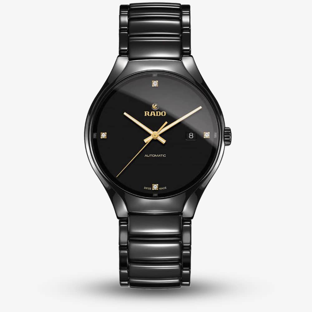 Rado brings us this stunning ceramic bracelet watch, transforming sophistication into comfort. This reinvention of luxury features smooth black links of high-tech ceramic holding a suave black dial, set with four diamonds and a date window for extra functionality.