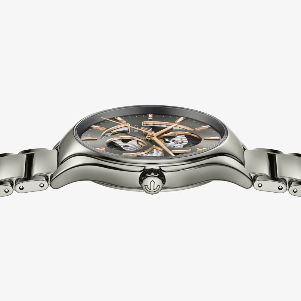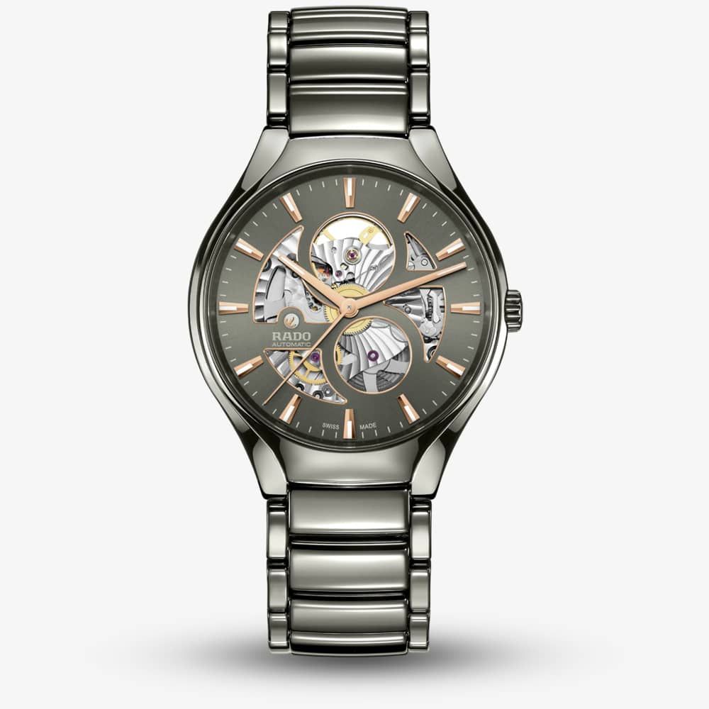 The Rado True Round Open-Heart features an open dial design showcasing the automatic Rado movement. The watch is crafted from grey high-tech ceramic and titanium, with a polished plasma high-tech ceramic bracelet for a sleek and modern look. It's a timepiece designed for those who appreciate contemporary style with lasting appeal.
