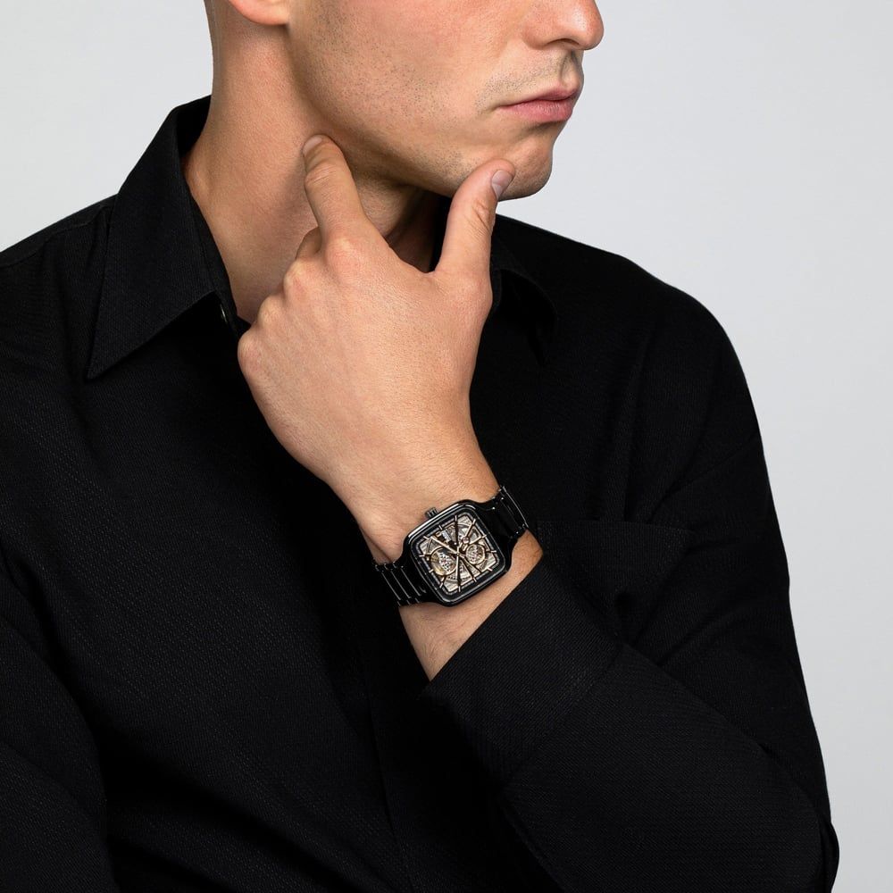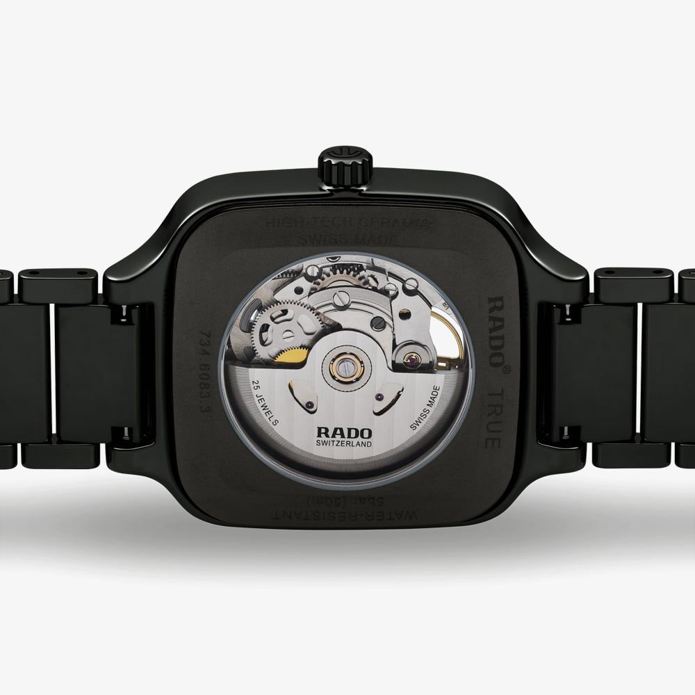 This True Square timepiece from Rado features a high-tech ceramic case that is light, scratch resistant and comfortable to wear. Powered by an automatic movement, the piece features a skeletal open-heart design with an exhibition case back.