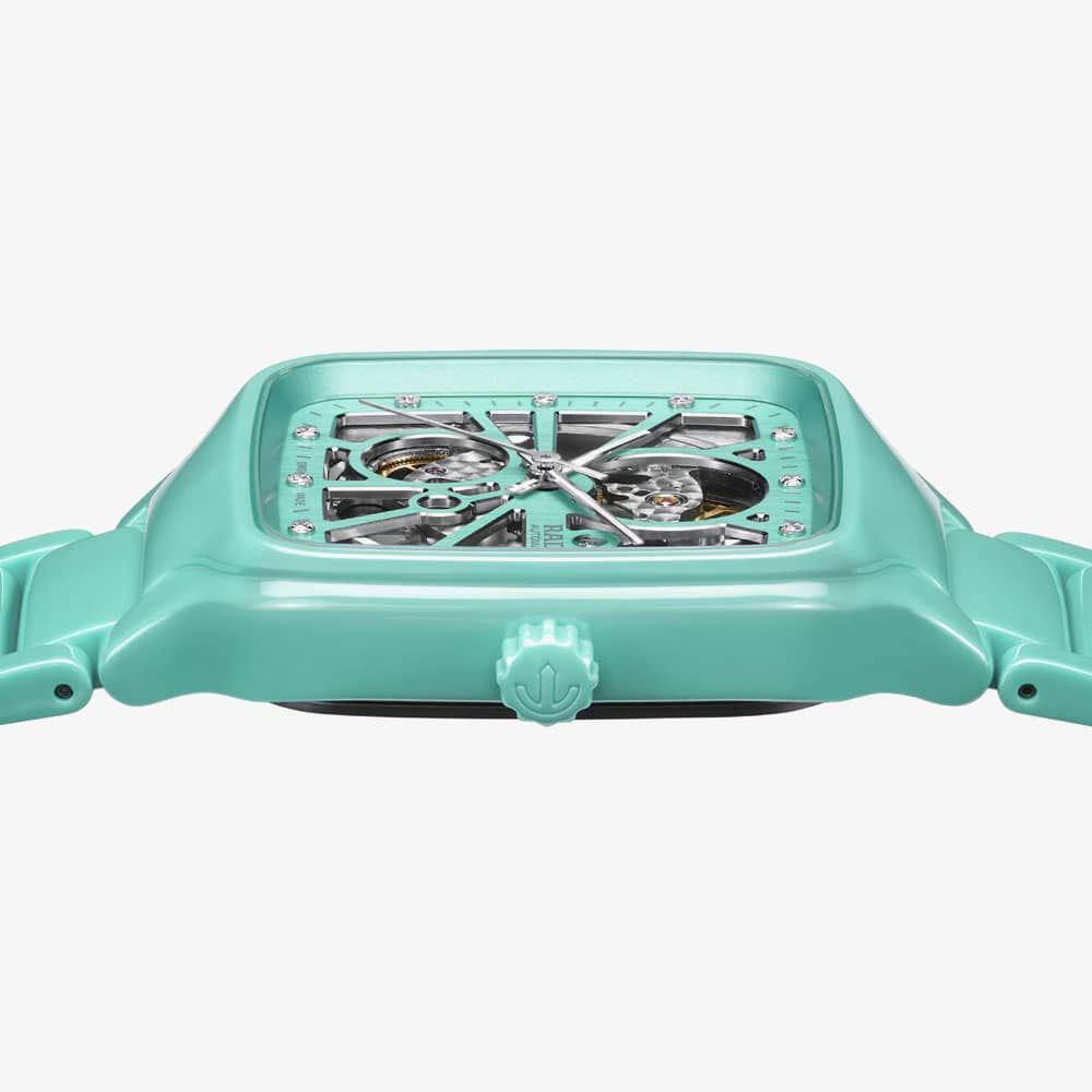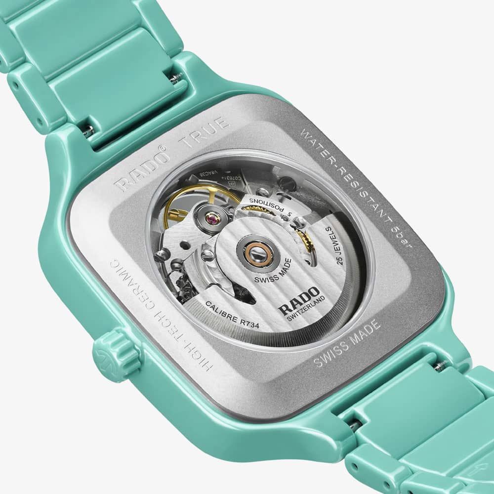 The Rado True Square Automatic Open-Heart watch is a blend of artistry and precision. It features a unique open-heart design that lets you see the intricate workings of the automatic movement. The watch has a sleek and modern look with a 38mm polished turquoise high-tech ceramic case and crown. Twelve diamonds add a touch of luxury and sophistication to the dial. The polished turquoise high-tech ceramic bracelet provides both comfort and durability.