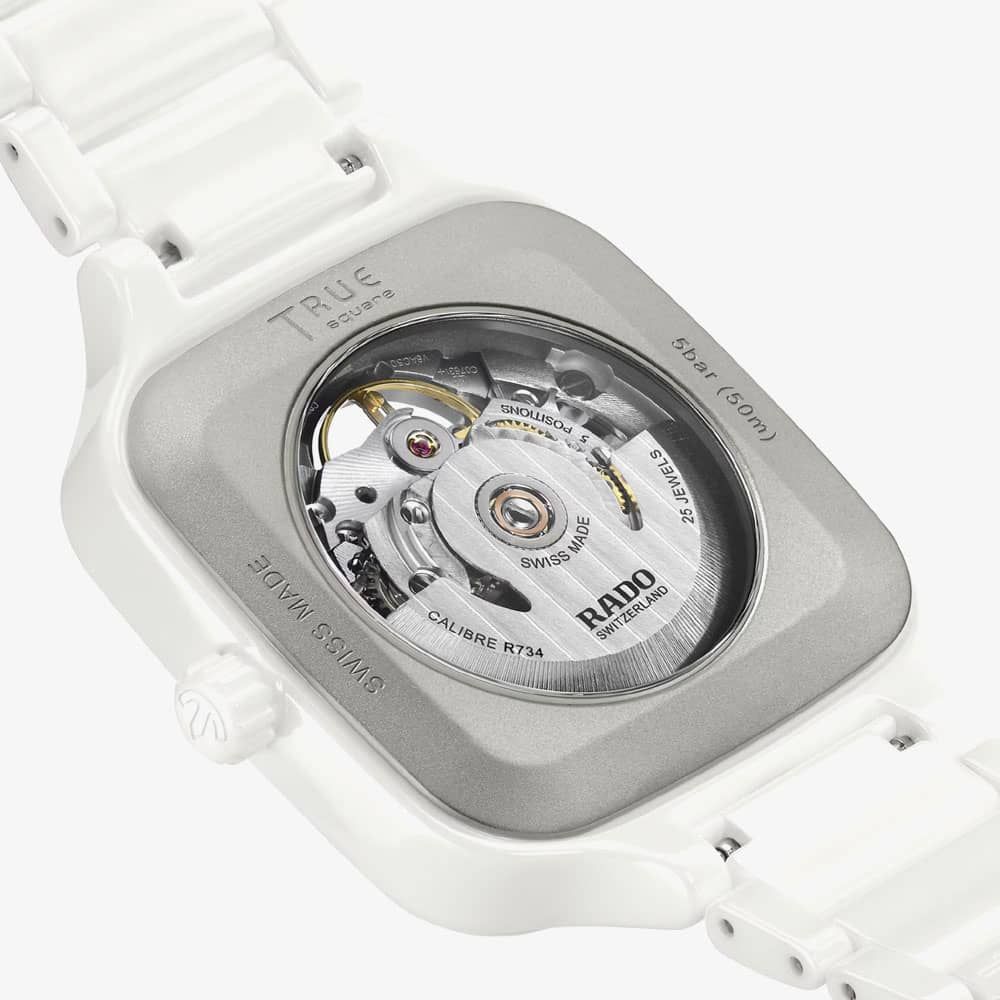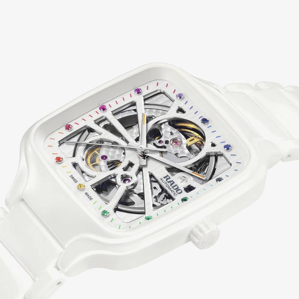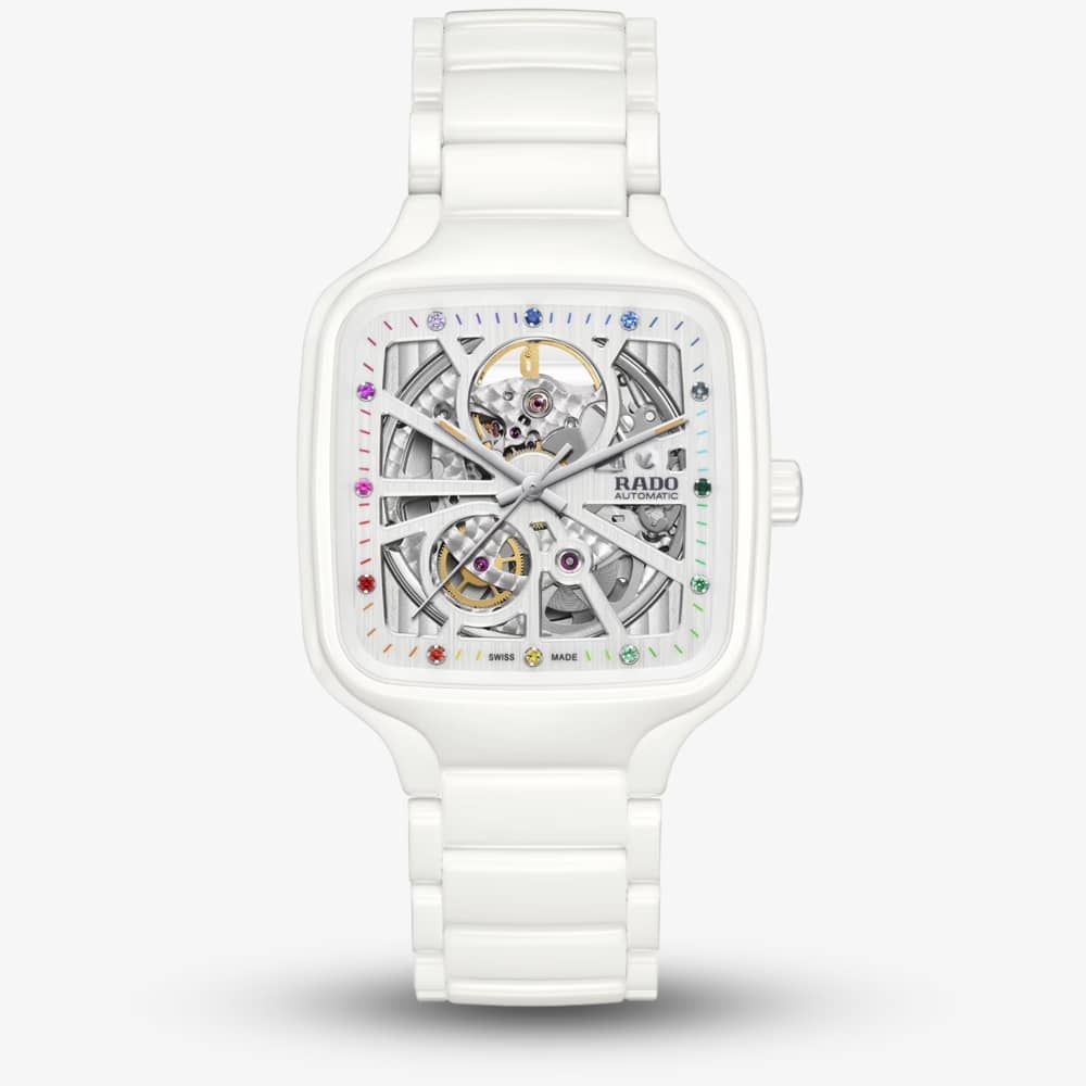 The Rado True Square Automatic Open-Heart watch is a blend of artistry and precision. It features a unique open-heart design that lets you see the intricate workings of the automatic movement. The watch has a sleek and modern look with a 38mm polished white high-tech ceramic case and crown. Twelve colourful gemstones add a touch of luxury and contrast to the dial. The polished white high-tech ceramic bracelet provides both comfort and durability.