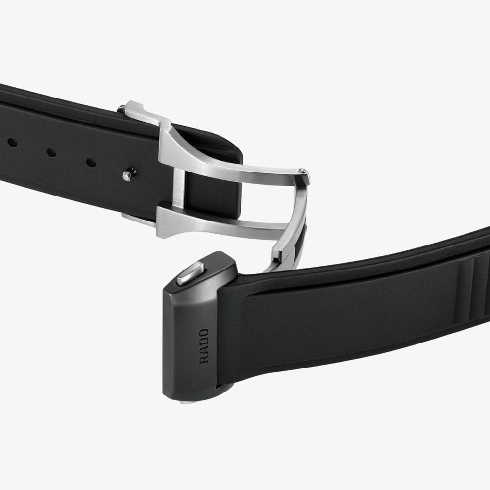 • Presented on a black rubber strap with push button deployment clasp.