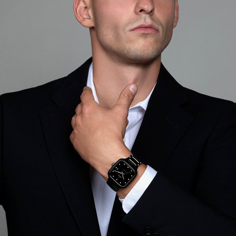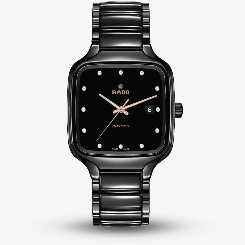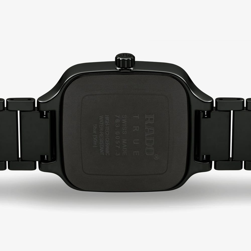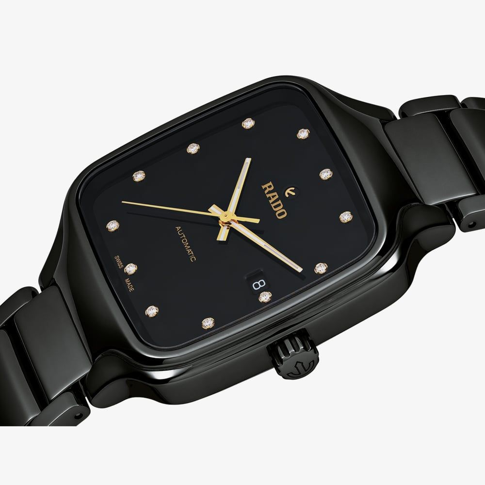 The distinctive True Square Diamonds watch is lightweight, scratch-resistant and extremely comfortable to wear. This watch boasts a black dial with contrasting sparkling diamond hour markers, luminescent hands and a clear date display.