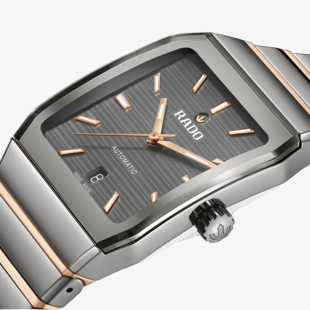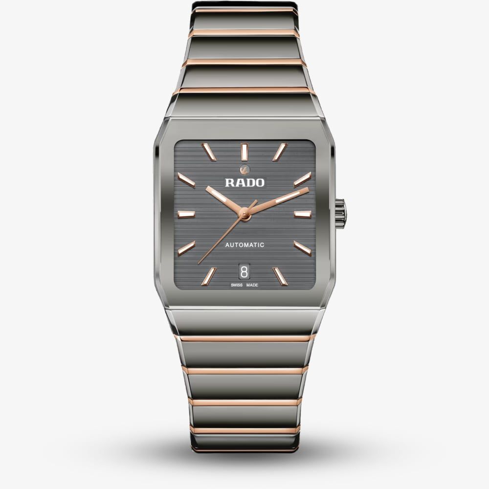 A striking timepiece that seamlessly blends Rado's signature sleek design with cutting-edge materials and a reliable automatic movement. This unisex watch exudes a sophisticated and contemporary appeal, making it a versatile accessory. The watch features a distinctive square-shaped case crafted from polished grey high-tech ceramic. This material is not only exceptionally lightweight and comfortable to wear but also renowned for its scratch resistance and durability, ensuring your watch maintains its pristine appearance.