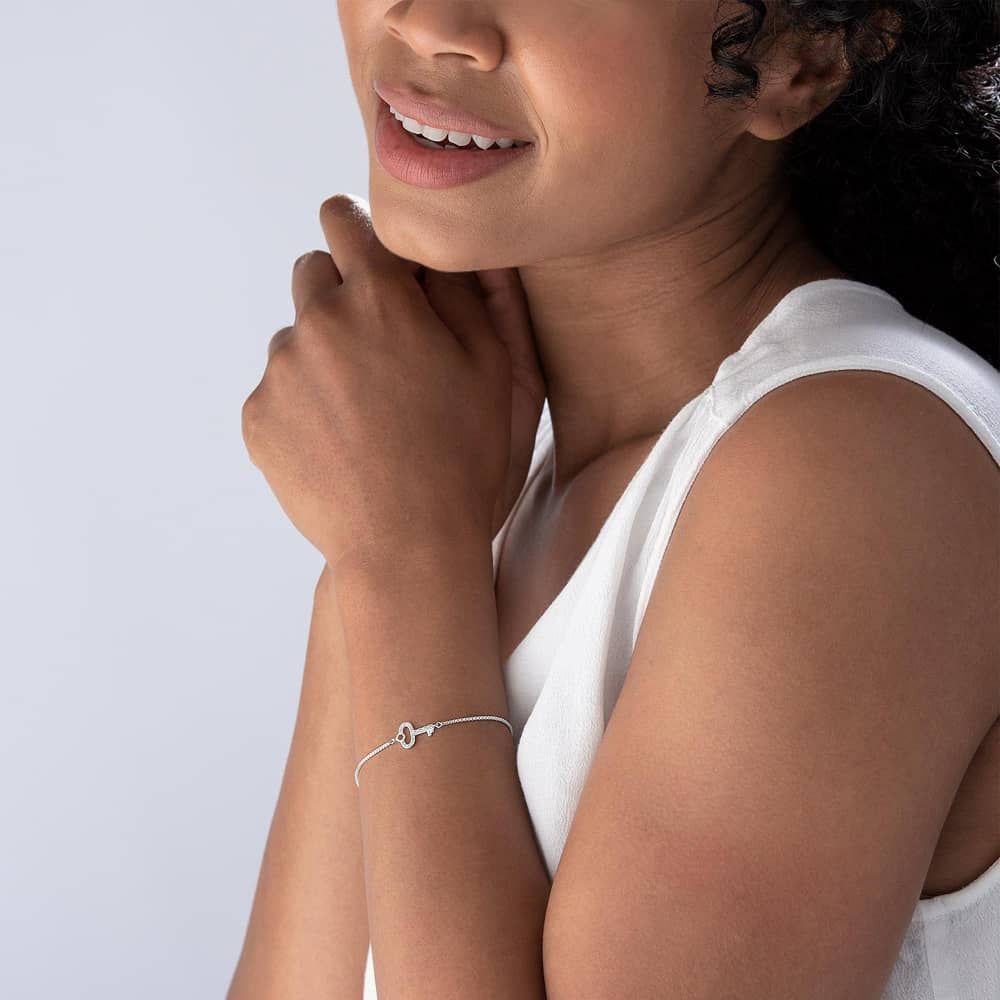 The Lauren Ralph Lauren toggle bracelet is delicately crafted from sterling silver. The bracelet features a key pendant adorned with white cubic zirconia stones set in four claws on a box chain. The chain is adjustable in length with a toggle clasp to adjust for the perfect fit.