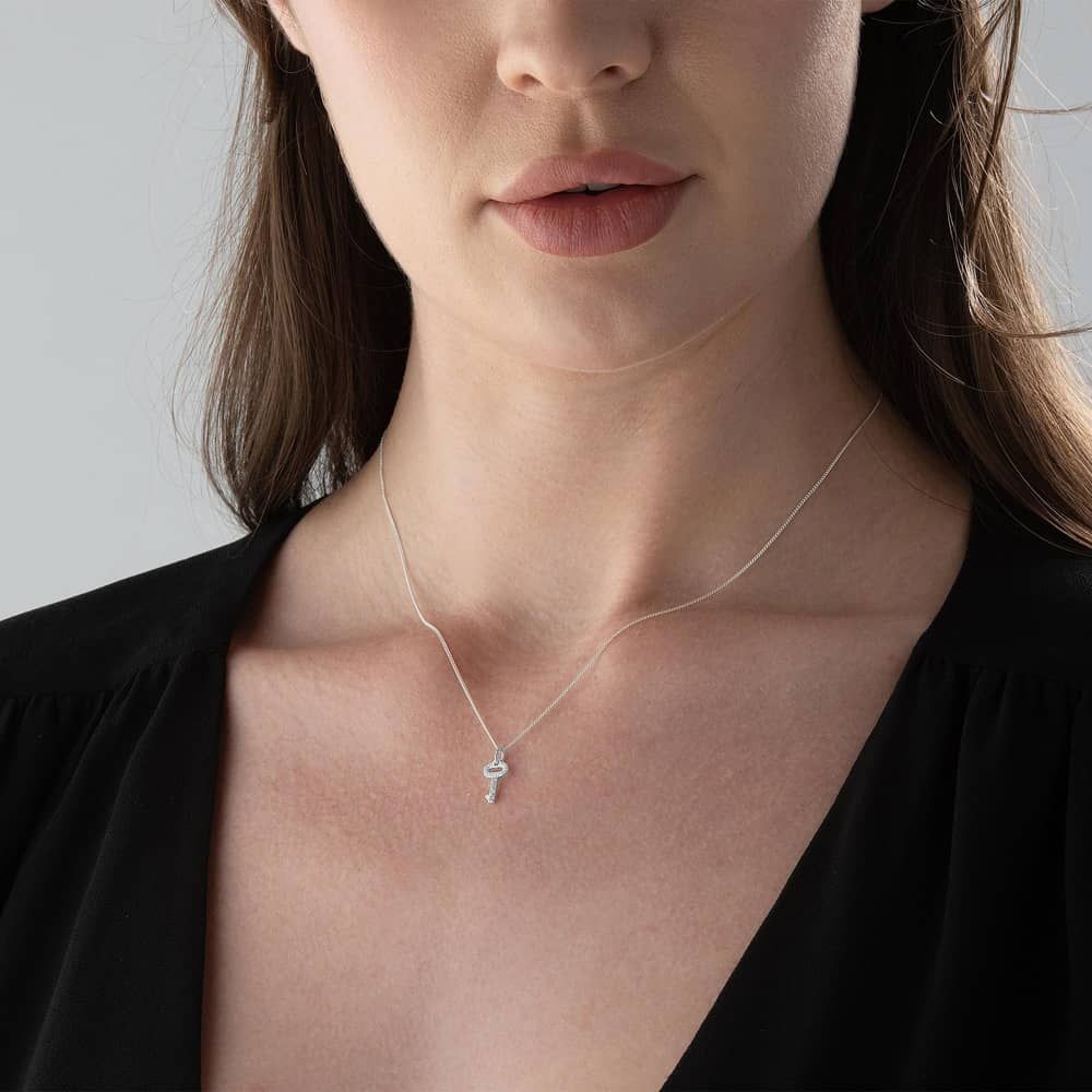 The Lauren Ralph Lauren pendant necklace is delicately crafted from sterling silver. The necklace features a key pendant adorned with white cubic zirconia stones set in four claws, suspended on a belcher chain. The chain measures 44cm in length.