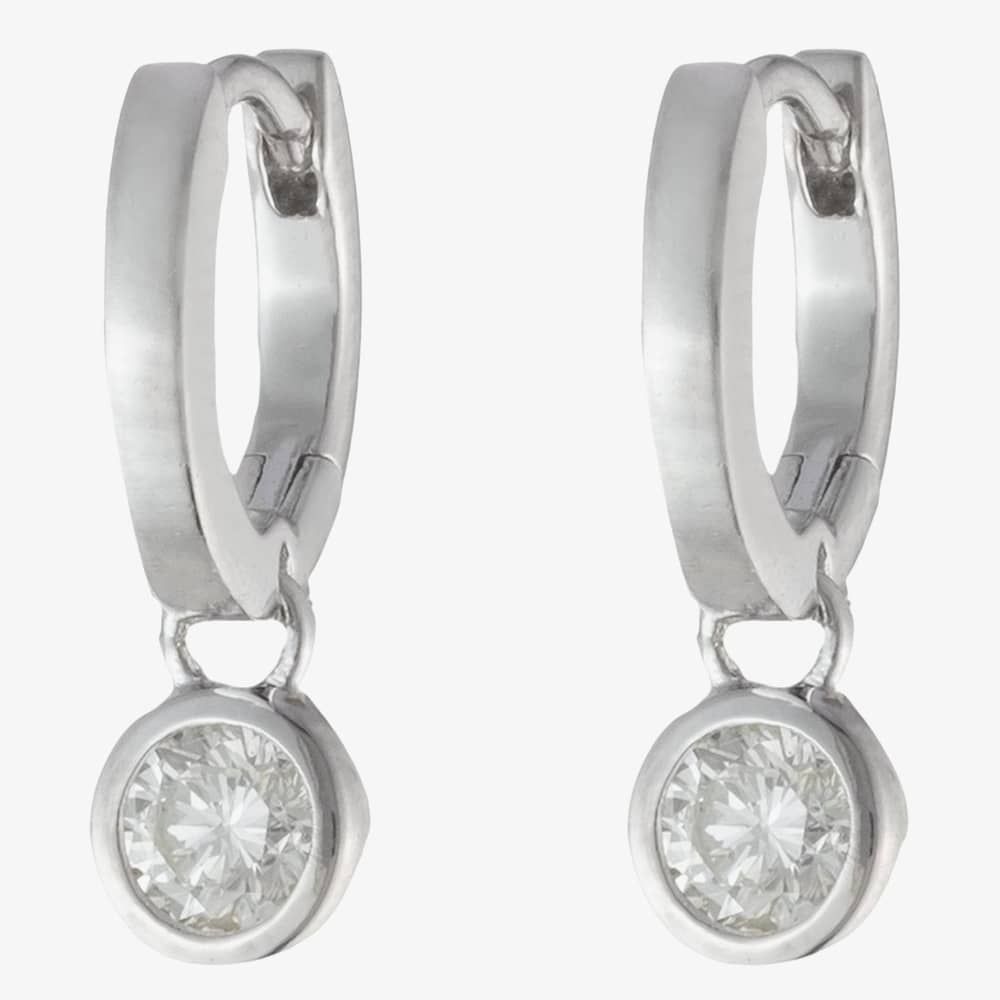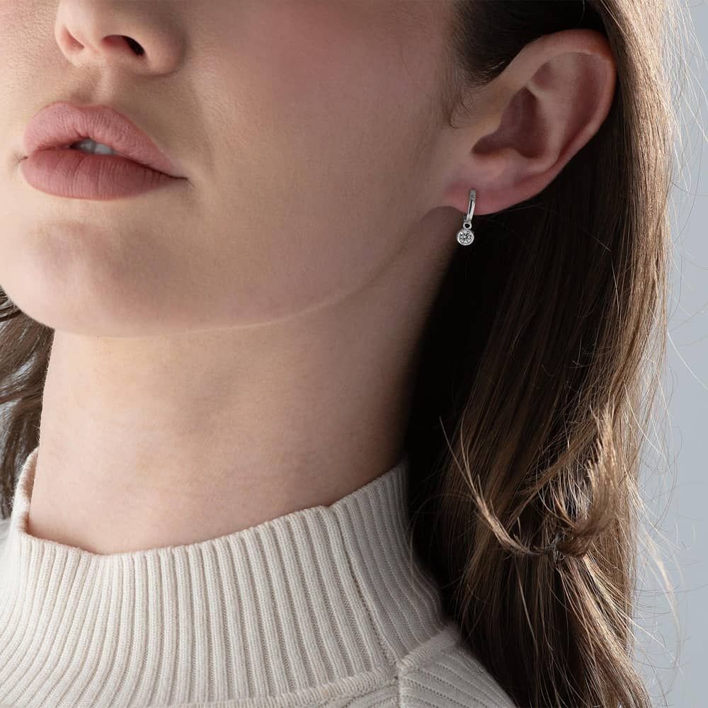 A pair of Lauren Ralph Lauren hoop earrings are delicately crafted from sterling silver and set with a white cubic zirconia pendant stone. Each hoop measures 15mm in size and closes with a hinged clasp.