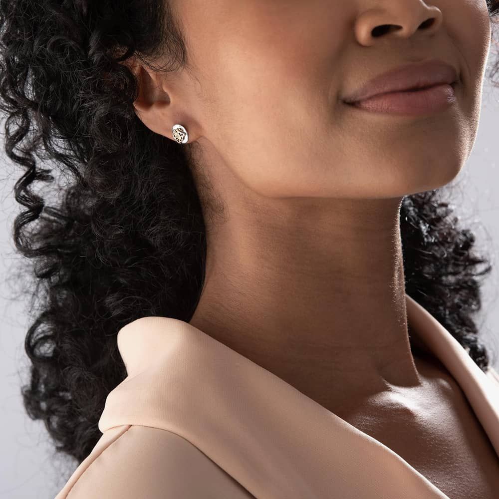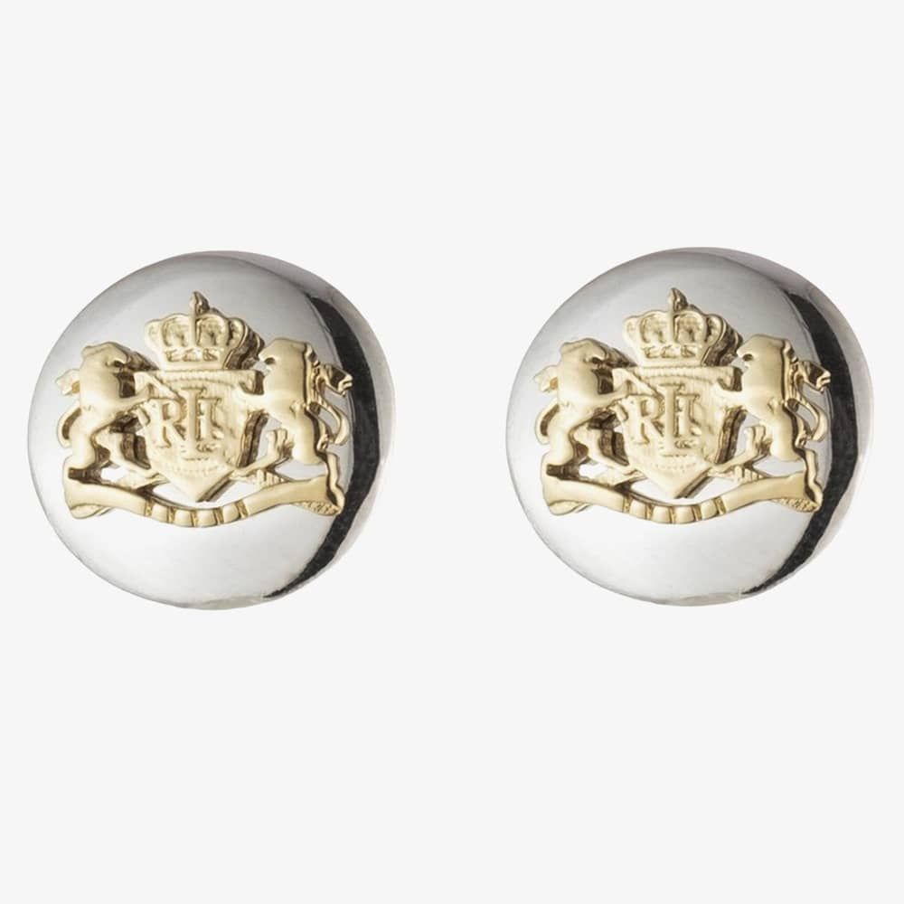 A pair of Lauren Ralph Lauren stud earrings delicately crafted from sterling silver and feature a gold-plated crest design. Each stud measures 10mm in size and closes with a butterfly clasp.