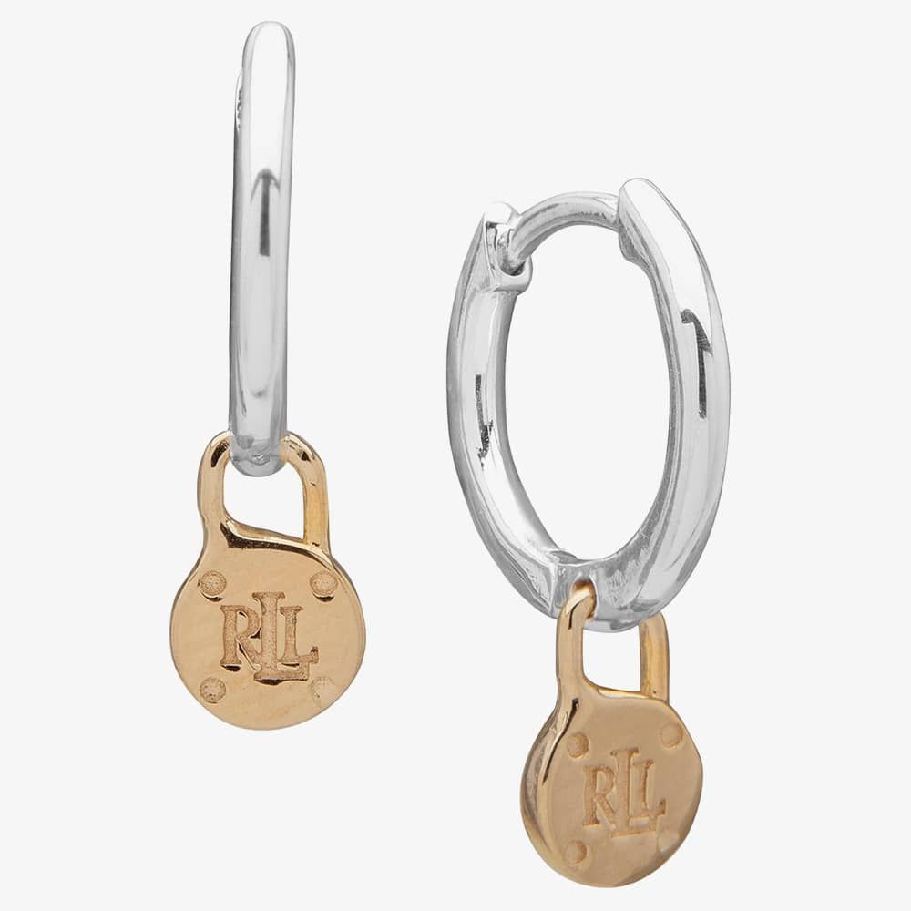 A pair of Lauren Ralph Lauren hoop dropper earrings are delicately crafted from sterling silver and feature a gold-plated logo pendant. Each hoop measures 10mm in size.