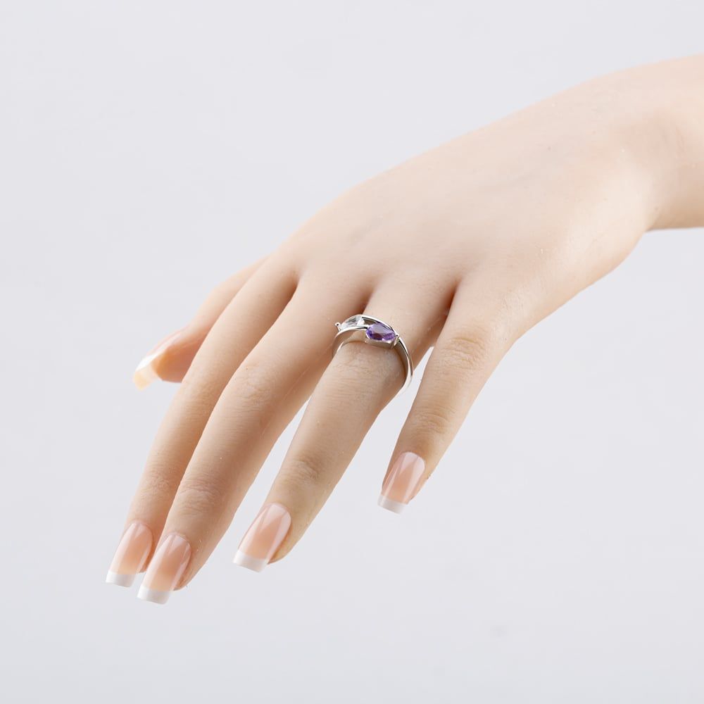 Modern and stylish, this wrap-around ring showcases two pear-shaped stone, a deep amethyst and topaz, set securely in sleek tension settings. Its open design wraps gracefully around the finger, offering a bold yet elegant look. Made from sterling silver with a rhodium-plated finish, this ring brings vibrant colour and contemporary flair to any ensemble.
